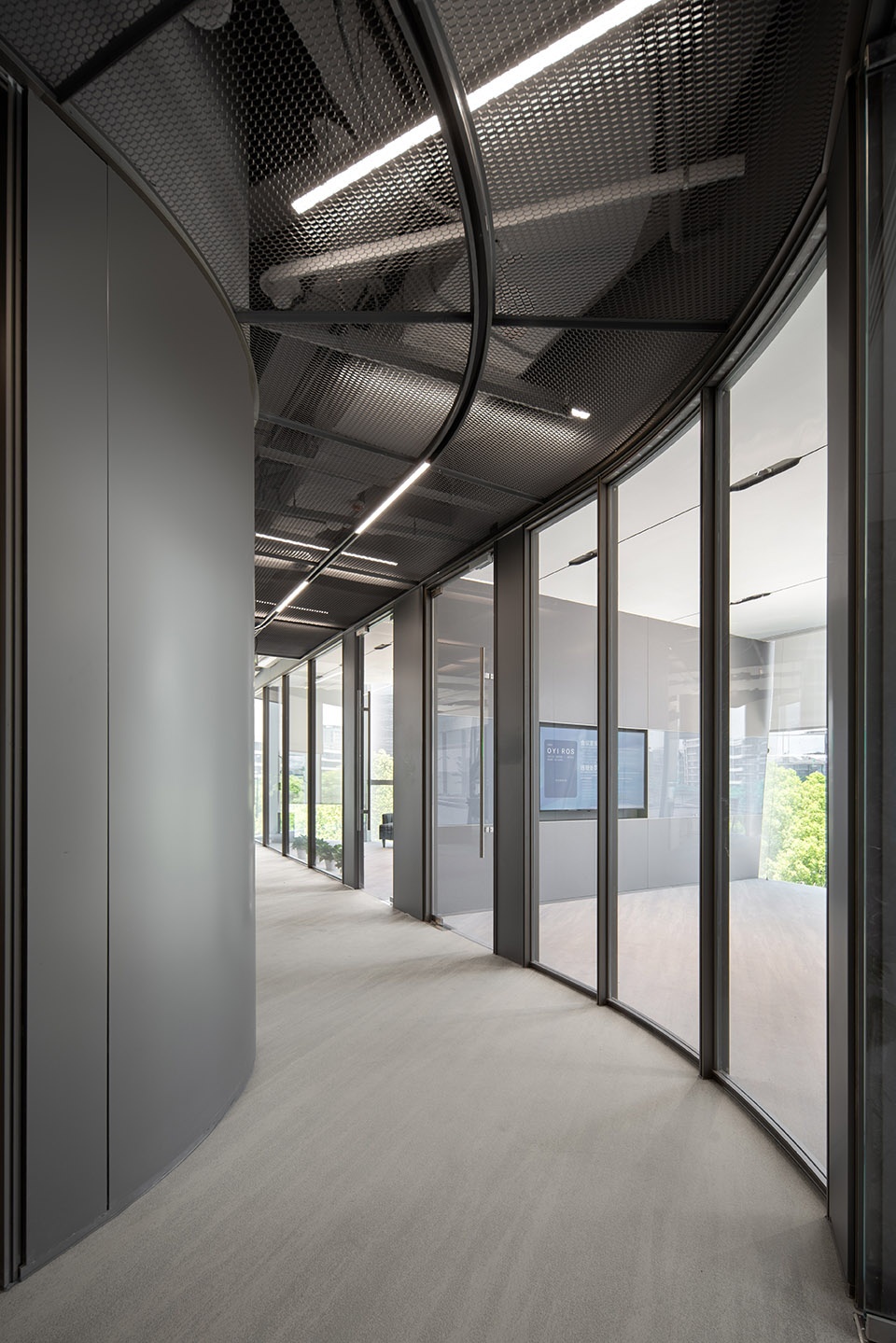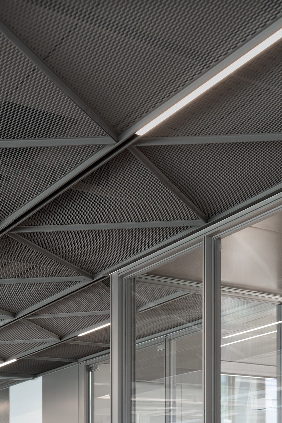 The combination of metal, textured paint, and glass prevents the space from feeling too cold. The soft texture of the paint neutralizes the sharpness of metal and glass, making the office look both professional and comfortable. Perforated metal mesh, as a continuation of the atrium’s design language, is used for ceilings and partitions. This translucent material divides the space without obstructing the view, creating a sense of transparency.