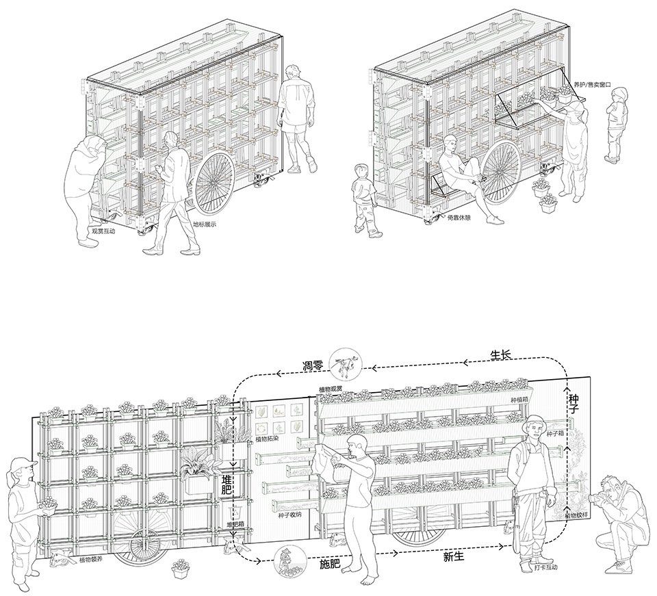 我们以传统卖花老农的三轮车厢为原型,将其重构为兼具运输,展示与互动功能的可打开式立体微花园。闭合时占地小,便于移动,展开后形成多层次花景。花厢的结构重现了市井卖花场景,唤醒城市乡愁。种子在花厢里发芽、生命在行列间孕育、废弃物在这里重生、人的双手重新学会触摸土地。