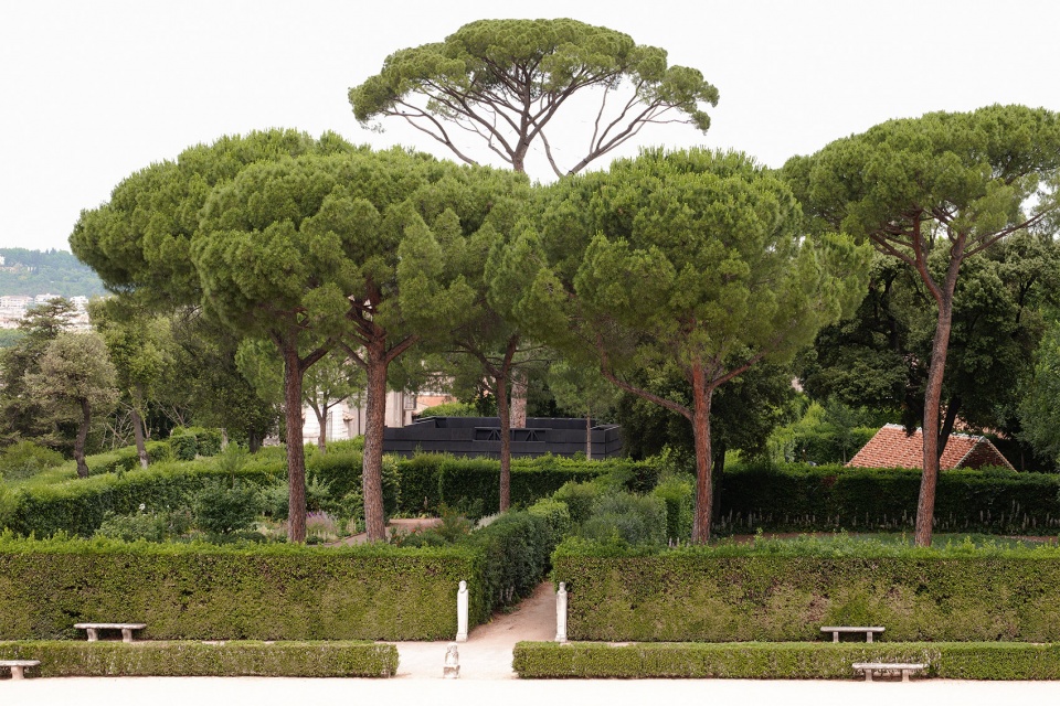 All along the perimeter, the project is punctuated by a series of openings that create poetic relationships with the surrounding environment: in some cases framing views of the city of Rome, in others glimpses of Villa Medici, and in others still the ancient pine or natural elements of the garden.