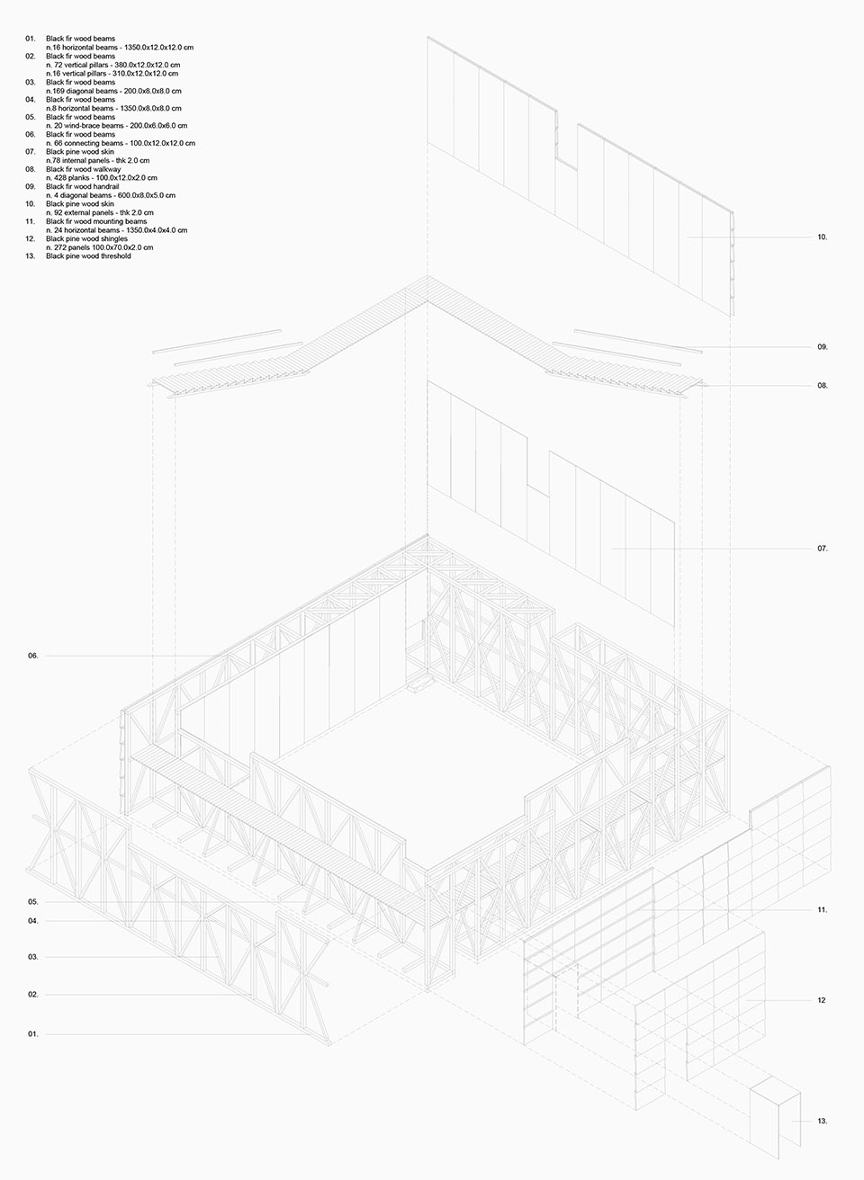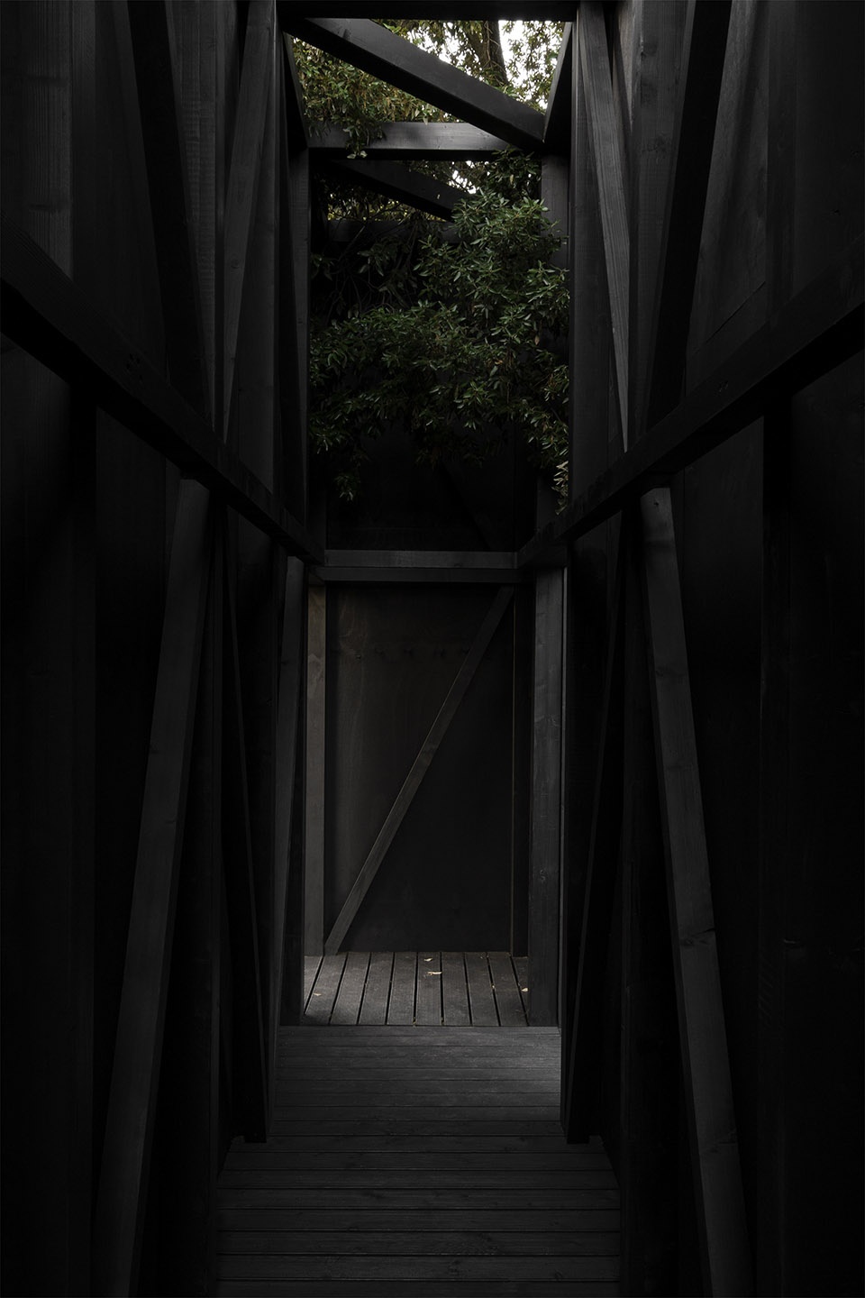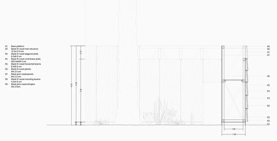 The enclosure is made entirely of dark pine wood, a material that enhances the visual experience through an optical effect: from the darkness of the inner space, the perception of the outer space is intensified. PAN-ORAMA is the design of a spatial experience made of revelations and continuous transitions, of compressions and expansions, of allusions and references.