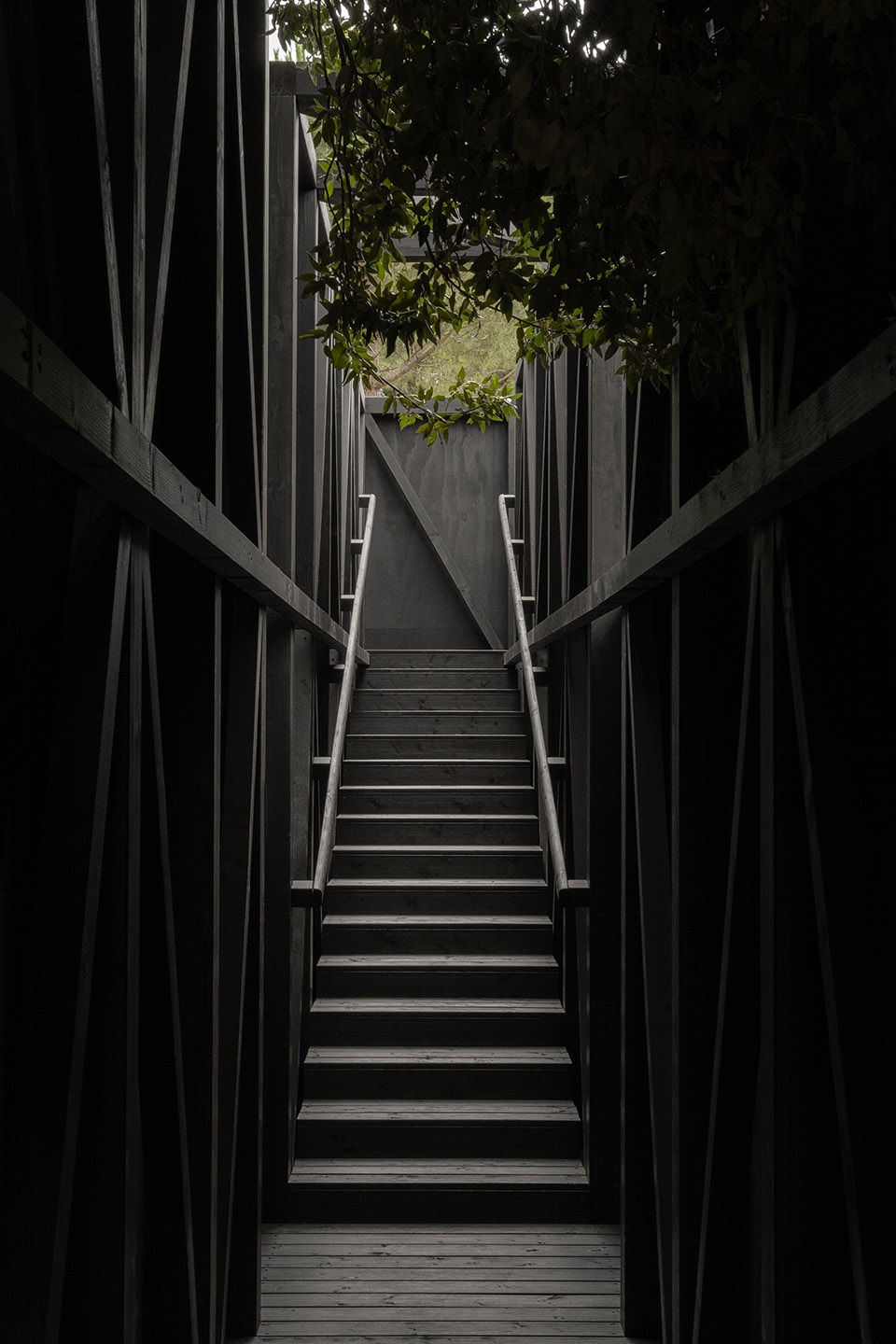 围合体完全由深色松木制成,这一材料通过光学效果增强了视觉体验:从内侧空间的黑暗中,外部空间的感知被进一步强化。PAN-ORAMA是一段空间体验的设计,充满了启示和连续的过渡,压缩与扩展,暗示与参照。