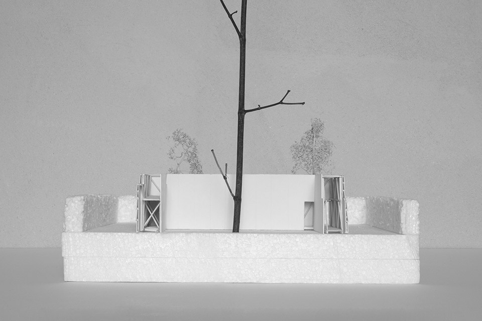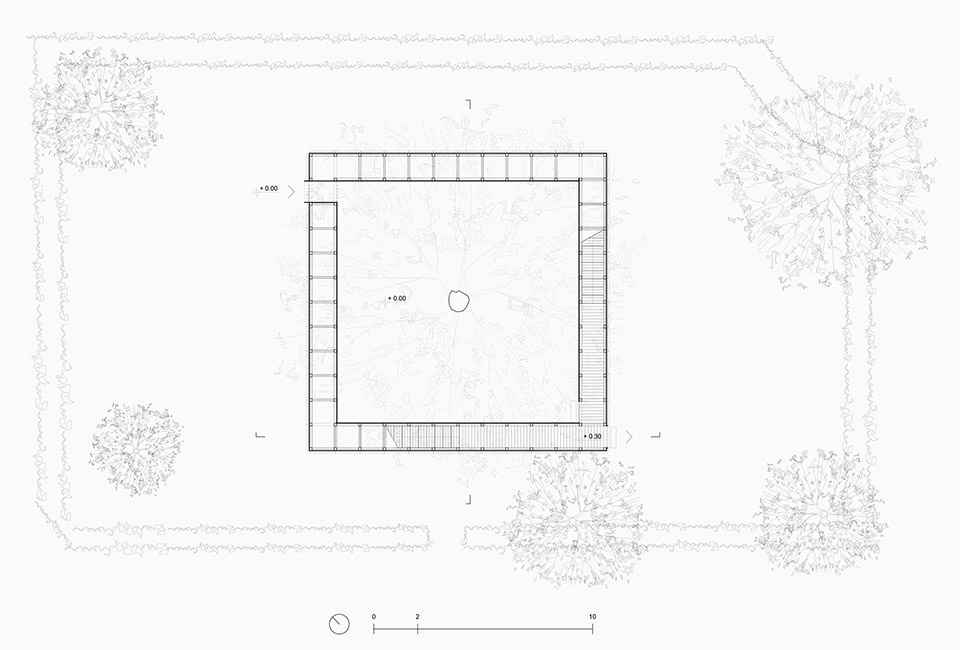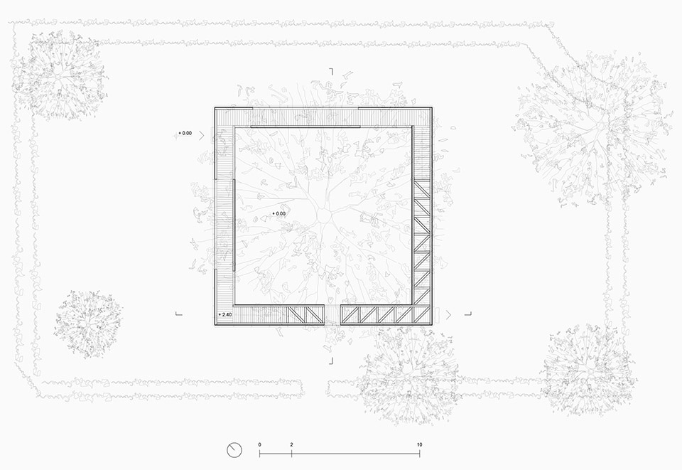 进入围合体的入口位于东侧。跨过门槛后,参观者可以选择停留在围绕松树的隐秘空间,或继续走向第二个入口,穿过该入口后便是通向围合体上部的小径。