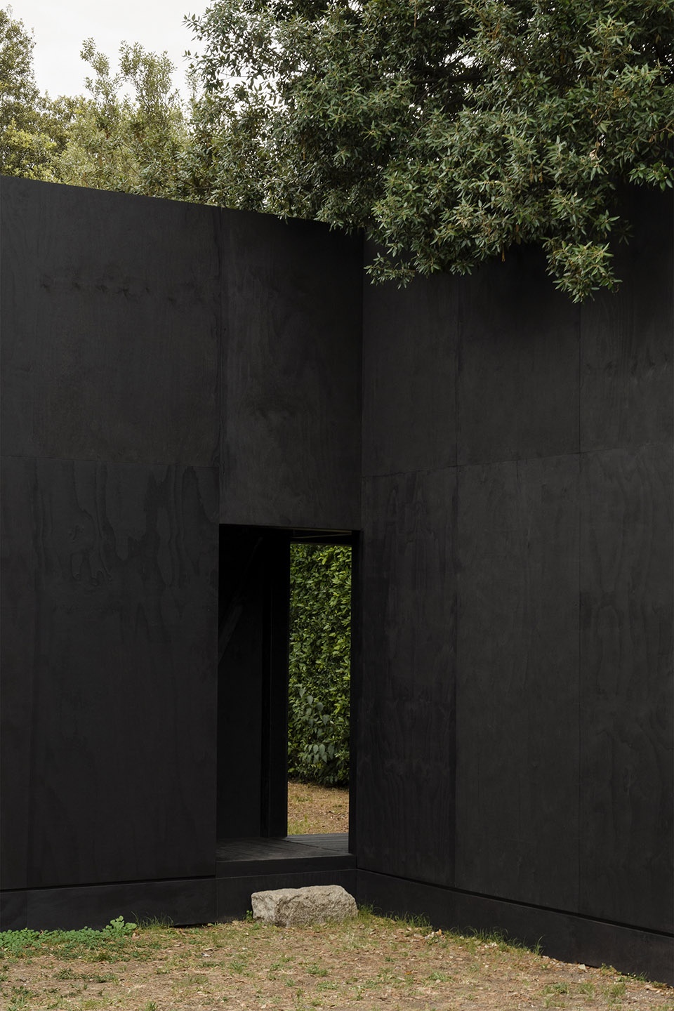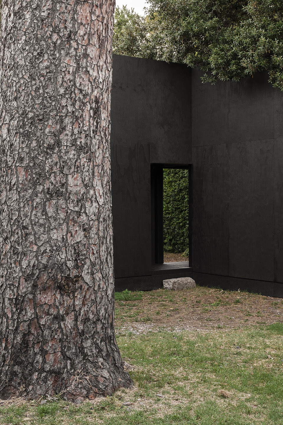 该项目由一个方形围合体组成,围绕着花园中的一棵百年松树,定义了两个截然不同的空间:一个内侧空间——更为亲密与冥思,面向松树和天空;另一个外侧空间,则与花园中标志性的树篱相呼应。