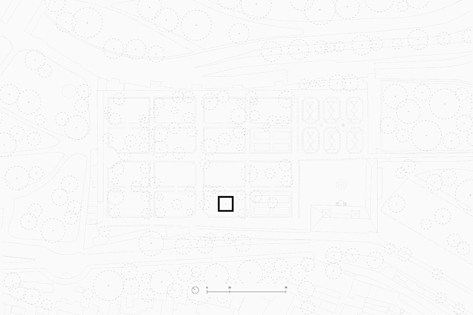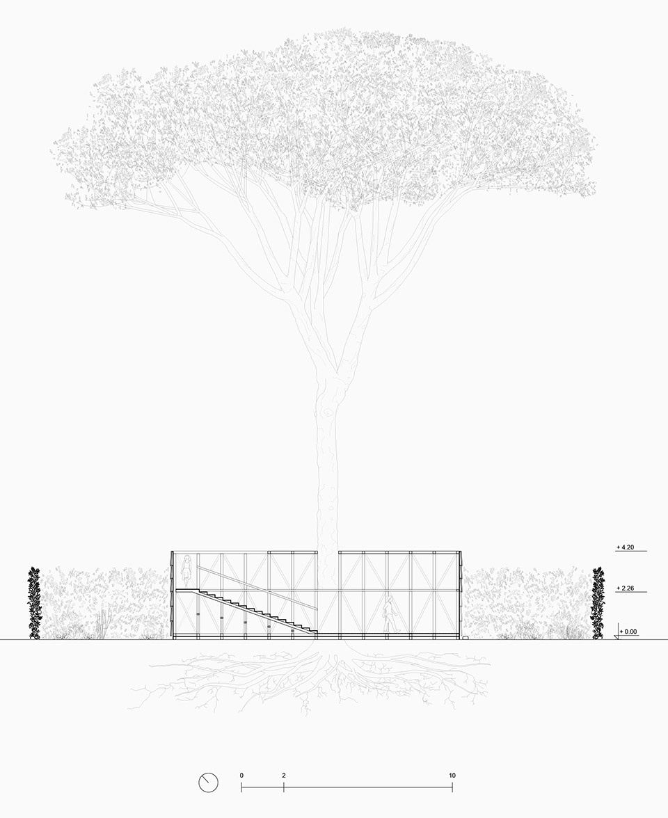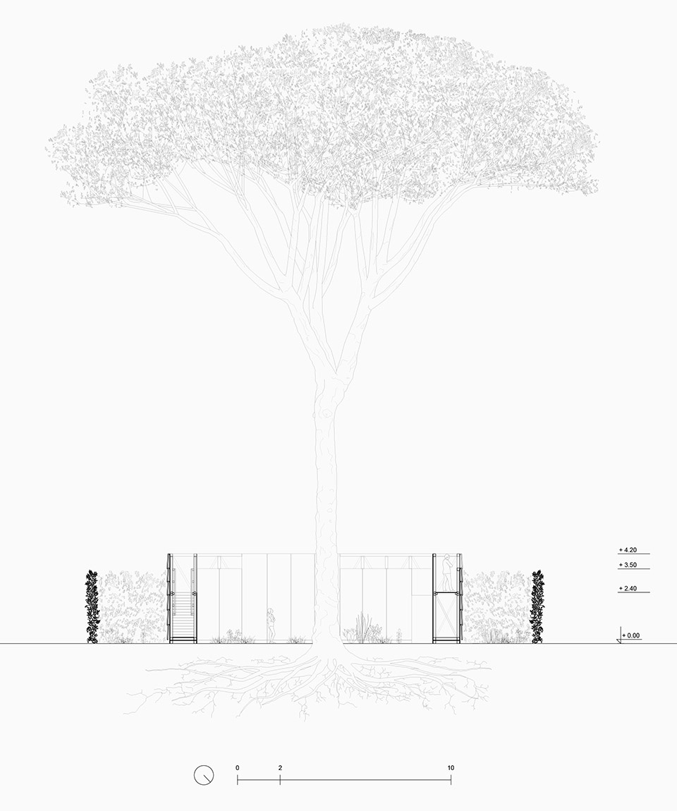 The project consists of a square enclosure that embraces a centuries-old pine tree in the garden, defining two distinct spaces: an inner one—more intimate and contemplative—facing the tree and the sky; and an outer one, in dialogue with the hedges that characterize the Villa’s gardens.