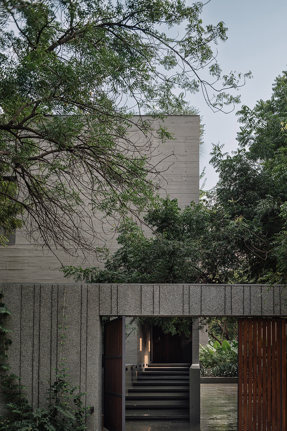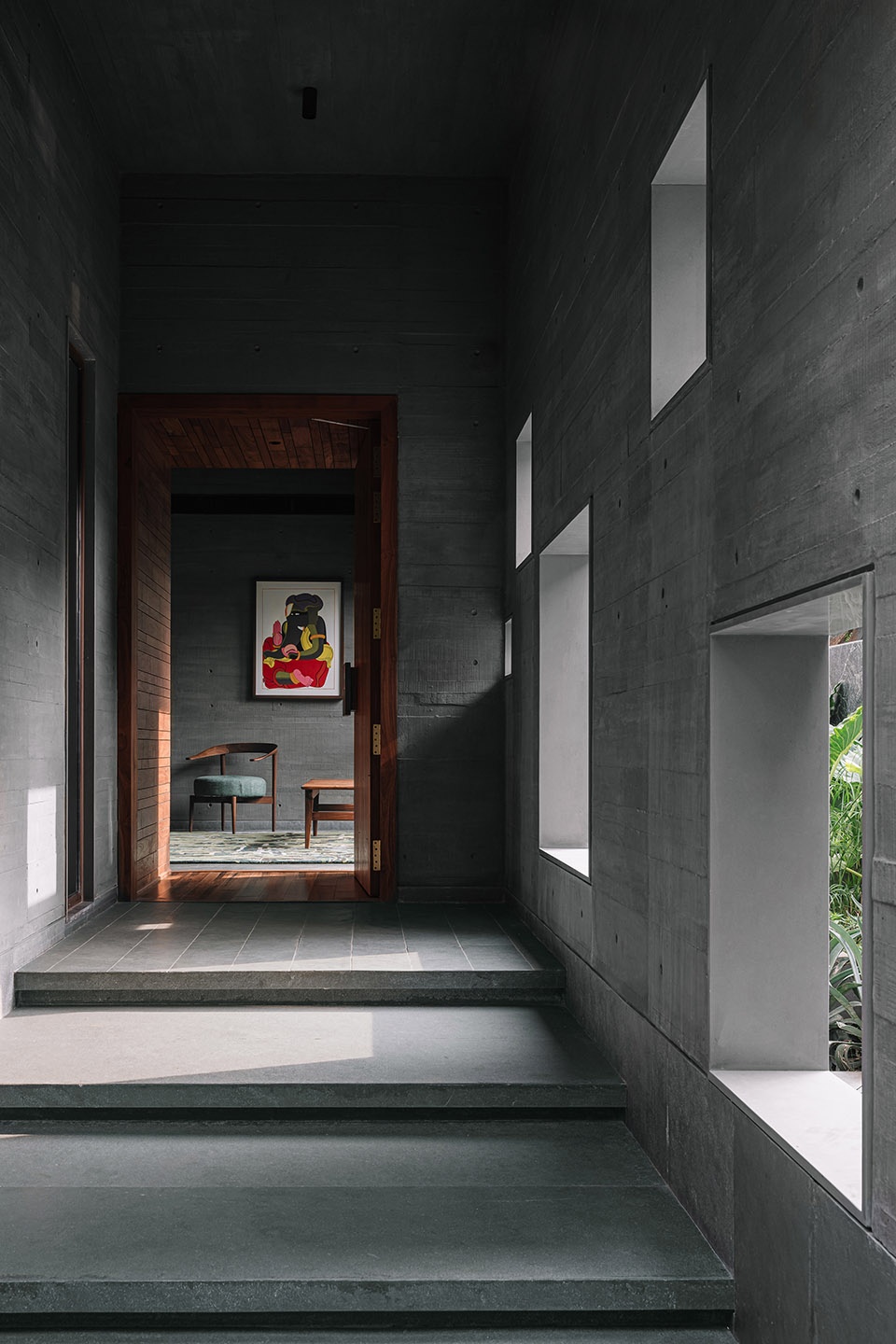 The influence of nature is evident from the moment one approaches the site. The boundary wall winds around a tree trunk to preserve its growth, and a downward-curving branch near the entrance lobby reinforces this connection. A dramatic entrance corridor with square punctures in the wall leads the visitors into the home. These carefully positioned openings transform an otherwise austere passage into a dynamic space, where dappled sunlight casts ever-changing patterns across the flooring and walls, while offering glimpses of the lush greenery beyond.