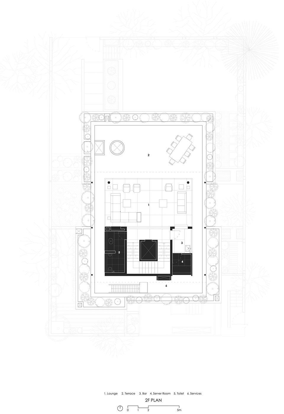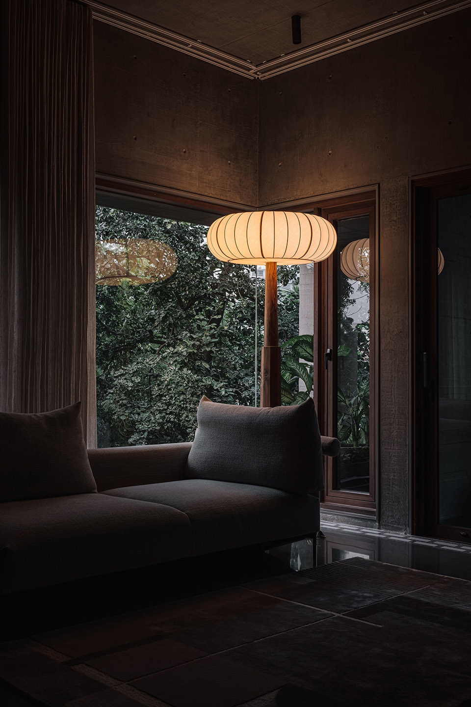 景观设计进一步模糊了自然与建筑的界限。除了保留的楝树外,设计师还精心挑选热带及本地植物,为绿意增添层次。入口旁的静水景营造温柔的声响,并映照天空与树影。在屋顶露台上,爬藤植物被有意沿女儿墙种植,随着时间推移将蔓延覆盖混凝土的锐利几何,使绿意自然“占领”建筑。