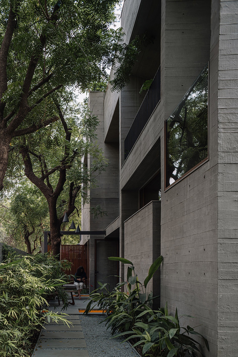 粗野主义建筑能否与自然如此亲密地融合,以至于仿佛树木亲手塑造了它?位于艾哈迈达巴德的Studio Saransh以MS House给出了大胆的回答。设计的起点是一个简单的承诺:无论如何都要保留场地上九棵成年的印度楝树。于是,一座“顺从自然意志”的混凝土建筑诞生了——从空间布局到建筑形态与材料选择,所有设计决策都受到自然的影响。这种对环境与语境的敏锐感知,是Studio Saransh一贯设计理念的体现——在功能优雅的基础上,形成有力量的设计语言。