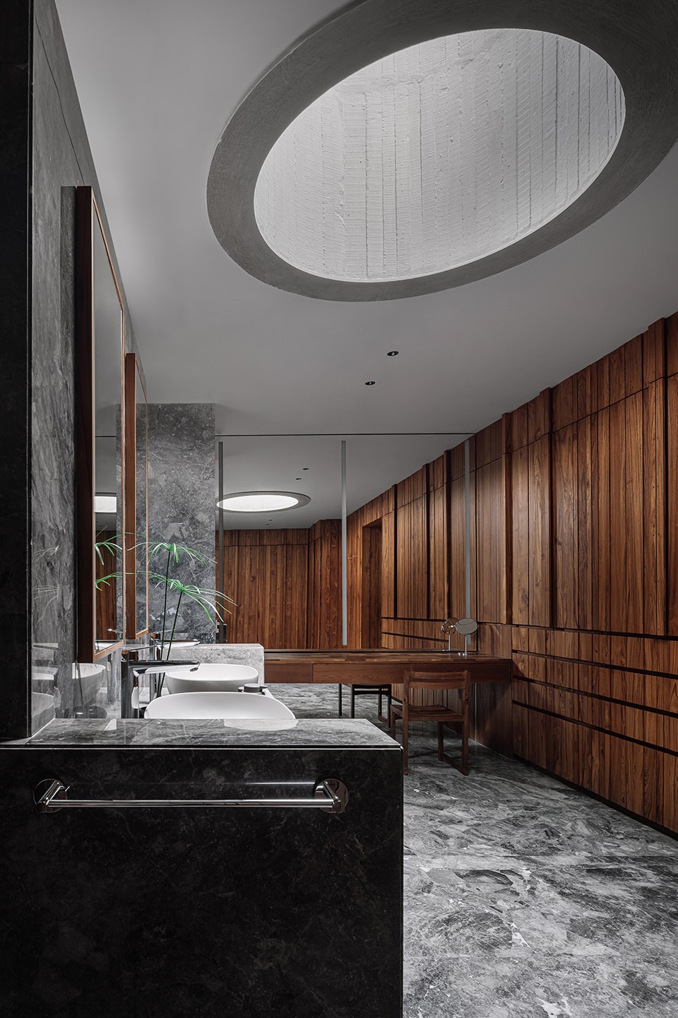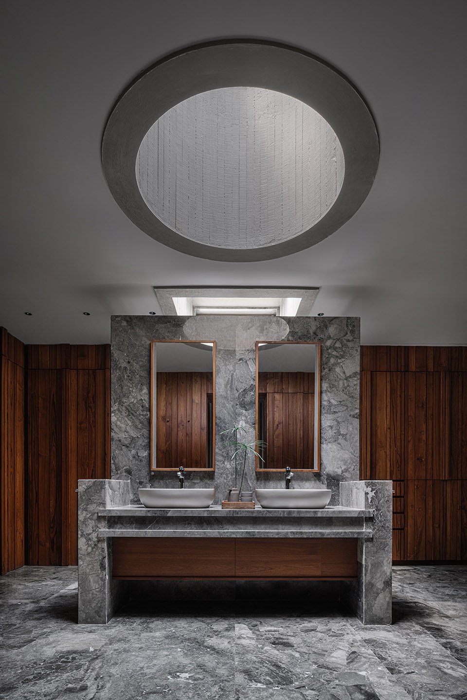 浴室设计细致入微,成为独立叙事。主卫通过两个天窗引入自然光——洗手台上方为圆形天窗,淋浴区隐藏方形天窗。露台黑色盥洗室采用整面玻璃,可眺望一排缅栀树,营造私人庭院的错觉。定制混凝土洗手台由Artemis Cast Stone联合设计,使玻璃可延伸至地面,并通过木百叶保障私密性。