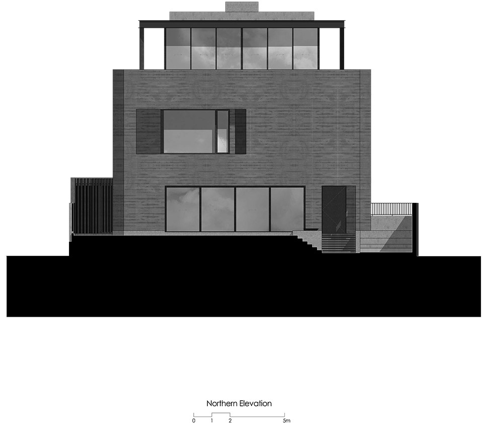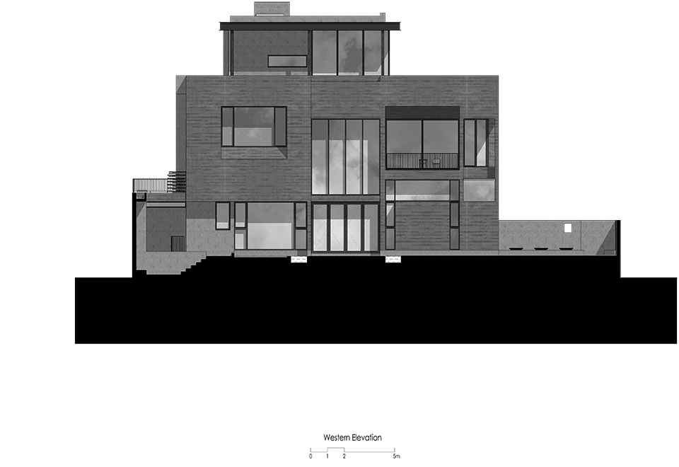 住宅外观延续了粗野主义的强烈特征,混凝土立面的几何形态在绿荫中悄然隐去。立面上的方形孔洞与深斜窗台既强化了光影变化,也柔化了建筑的视觉印象。表面以带木纹质感的混凝土饰面完成,与树干纹理相呼应,使结构更具触感与亲和力。而在这冷峻几何的外壳之下,MS House的真正成就在于:一座“粗野主义的房子”,被转化为一处温暖的“家”。