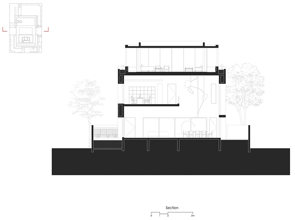 在上层,中央挑空转化为一个俯瞰餐厅的书房。每个空间都与室外的树木建立了独特关系。主卧位于起居室上方,带有一处阴凉阳台,可俯瞰树梢;女儿的卧室则坐落于更为安静的后翼,面向后院。二层设置了家庭休闲露台,带有客厅、吧台与盥洗间,成为家人于楝树冠层之上的社交场所。