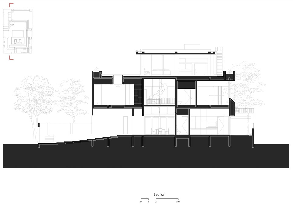 屋内的布局围绕一处双层挑空的中央空间展开,这里以一棵印度楝树为核心。建筑东西向布置,这个空间成为家人晨饮与聚餐的场所——在树荫之下的日常生活。