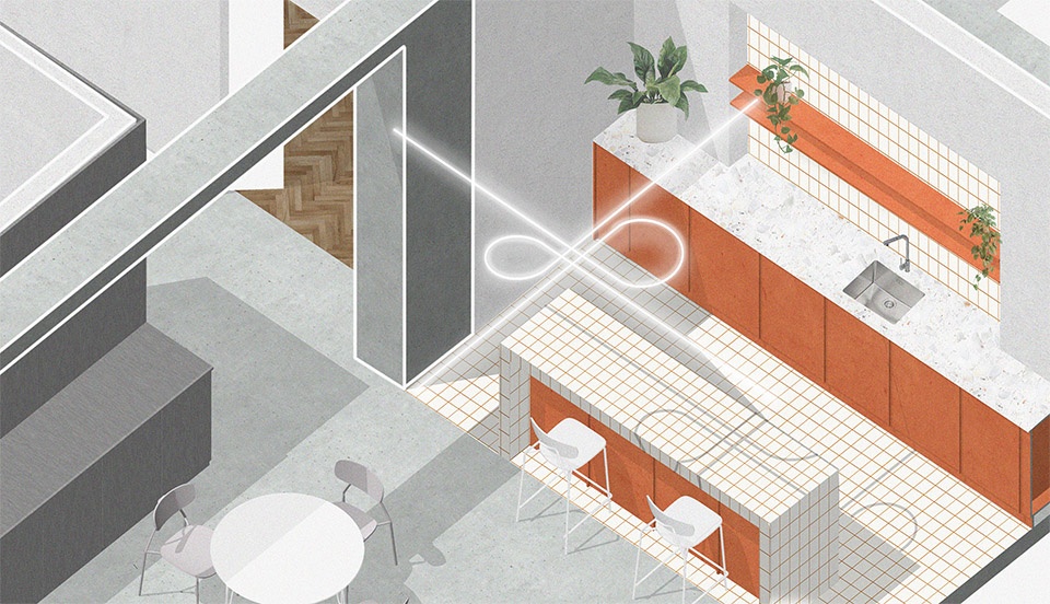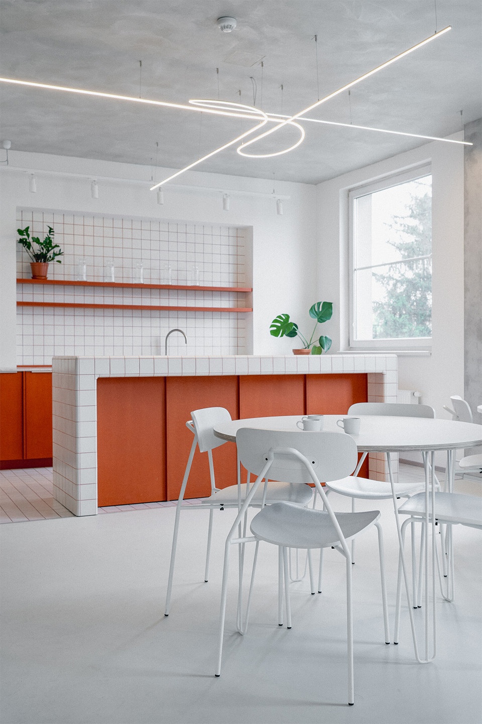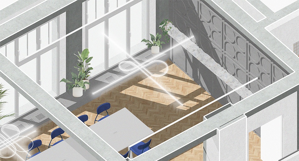 公司原有标志呈“交叉路口”造型,经KNOW HOW solutions重新设计后,成为本次空间设计的重要灵感来源。Studio COSMO的建筑师在室内设计中延续了品牌视觉语言,将其融入定制灯具中。这些灯具的造型呼应了“交汇”的意象,象征性地将企业的专业领域与空间美学相连。