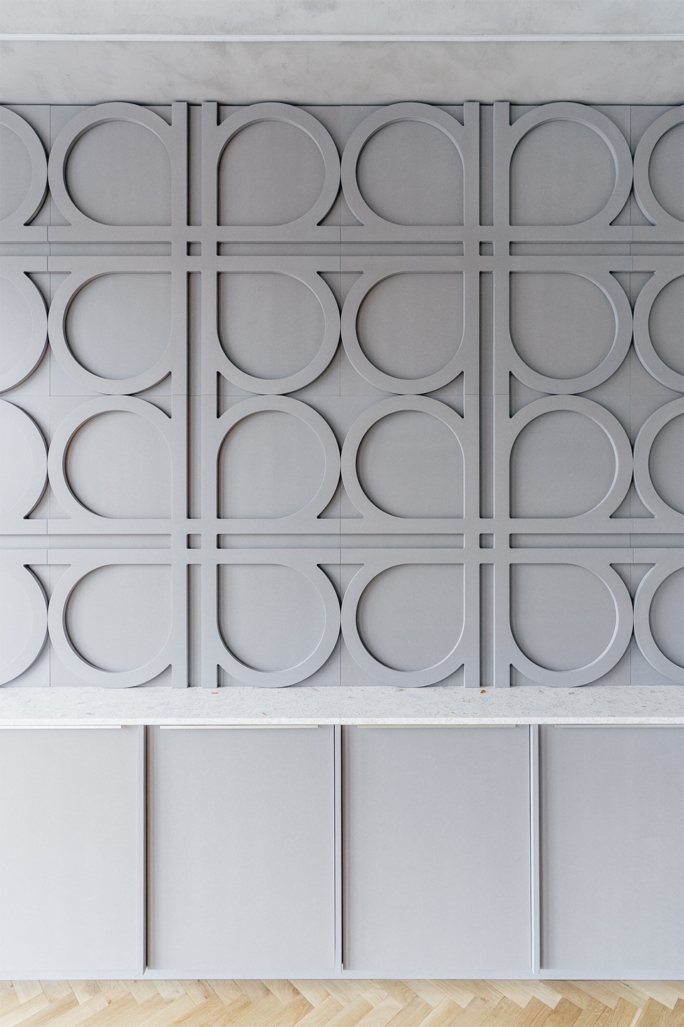 The materials used underline the precise and contemporary character of the space—the kitchenette features stainless steel cladding and a ceramic island, while the meeting room includes custom MDF paneling that incorporates the company logo motif as a pattern. These unique elements and custom furniture were supplied by specialists from the company Brick.