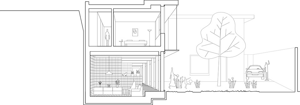 在一片高密度的城区之中,一条狭窄的巷道通向街区中央一块轮廓不规则的地块。这里原先被十三个普通的车库占据,如今经过一次彻底的蜕变,重生为一个由单户住宅、瑜伽教室与咖啡厅组成的当代复合建筑。设计以敏锐的空间洞察力为前提,将两个体量沿场地边界布置,巧妙地借用了原有高墙的界面条件,最大化利用场地潜力。