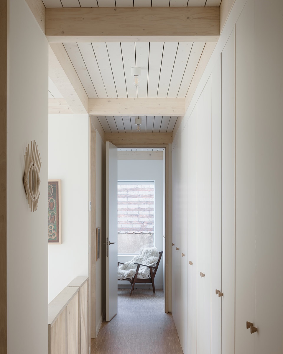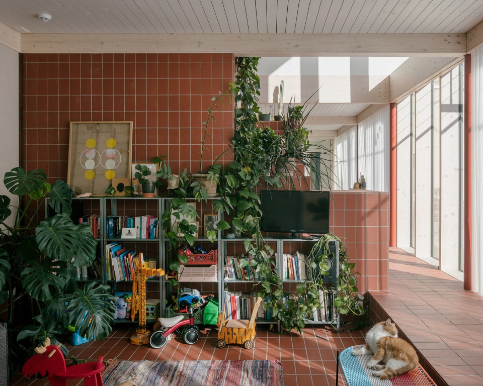 住宅部分通过一整面朝南的玻璃立面与花园无缝衔接,模糊了室内外的界限。通高的中庭中,一座蜿蜒的楼梯贯穿上下楼层,在流动的空间中柔和地划分出不同的生活场景。立面上方形的开口框取了庭院的绿意,使室内充盈着宁静与自然的气息。建筑采用预制木结构系统,展现出质朴而坚实的特征;木质天花与赤陶地面为室内带来温暖而亲密的氛围。外立面以浅米色的碎纹砖砌成,赋予建筑体量一种整体的雕塑感,与周围的城市肌理自然融合。
