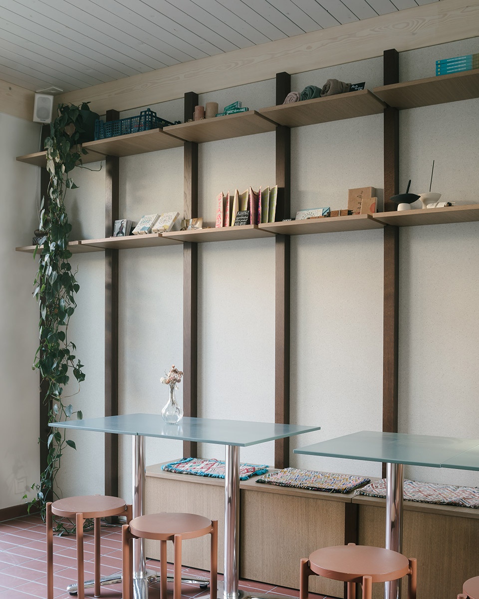 两座建筑体之间由轻盈的玻璃连廊相互连接,围合出一座绿意盎然的城市花园。这样的空间布局充分利用了场地的朝向,在保持私密性的同时,巧妙地框取多重视角。从巷道望去,花园若隐若现;而独立的出入口则清晰区分了住宅与瑜伽空间的使用动线,使整体建筑在分与合之间保持有机统一。两栋主建筑均为两层空间,其中一部分面向街道,容纳了咖啡厅与瑜伽空间,成为公共与私密之间的缓冲地带。大面积的窗洞引入意想不到的景深视野,使建筑与社区环境之间形成一种开放而和谐的互动关系。