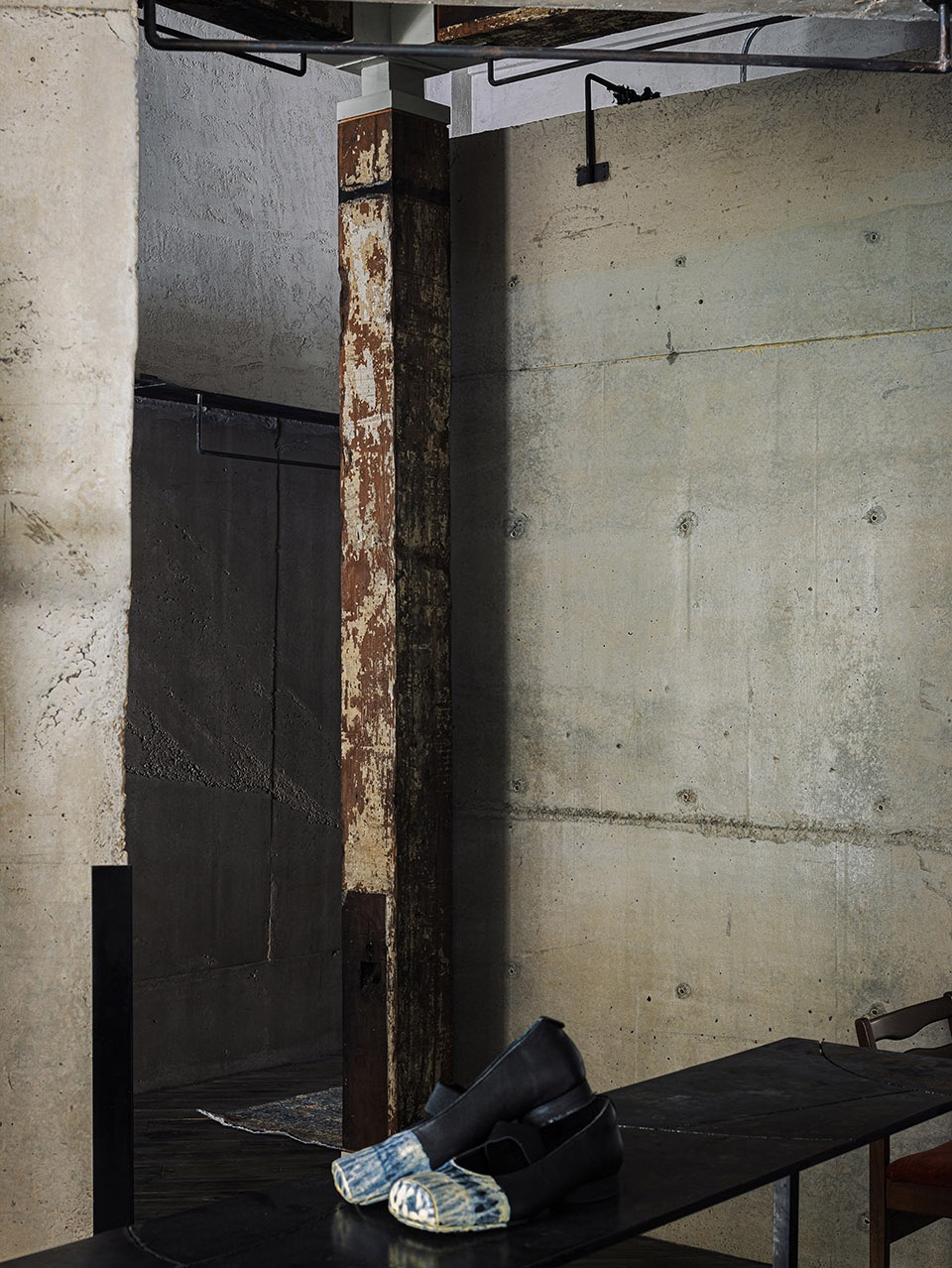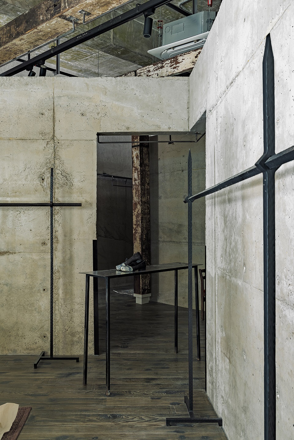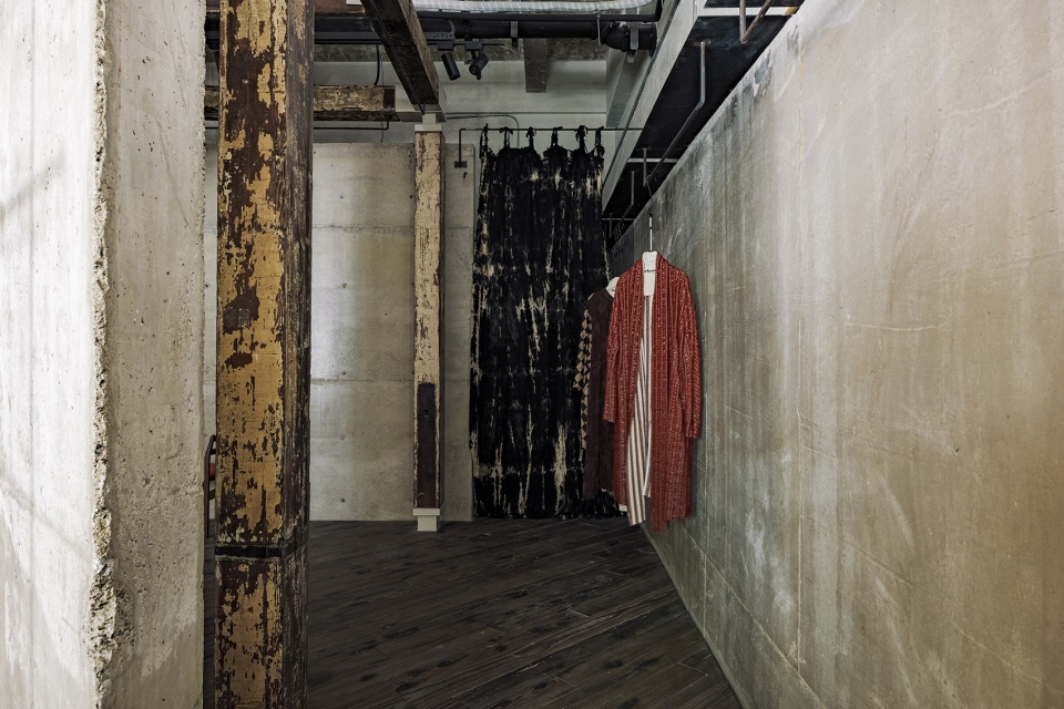 空间如服装,通过材质叠穿来表达性格。清水混凝土为基底,是利落的黑白暗调,是独立女性冷静坚韧的外在。老旧木板铺地,是温暖的触感,延续着品牌工作室的熟悉记忆。老梁木构架于顶上,如同为冷静的空间披上一件温暖的外套,形成强烈的视觉与情感反差。
