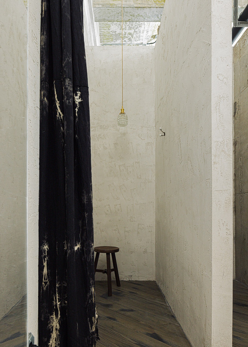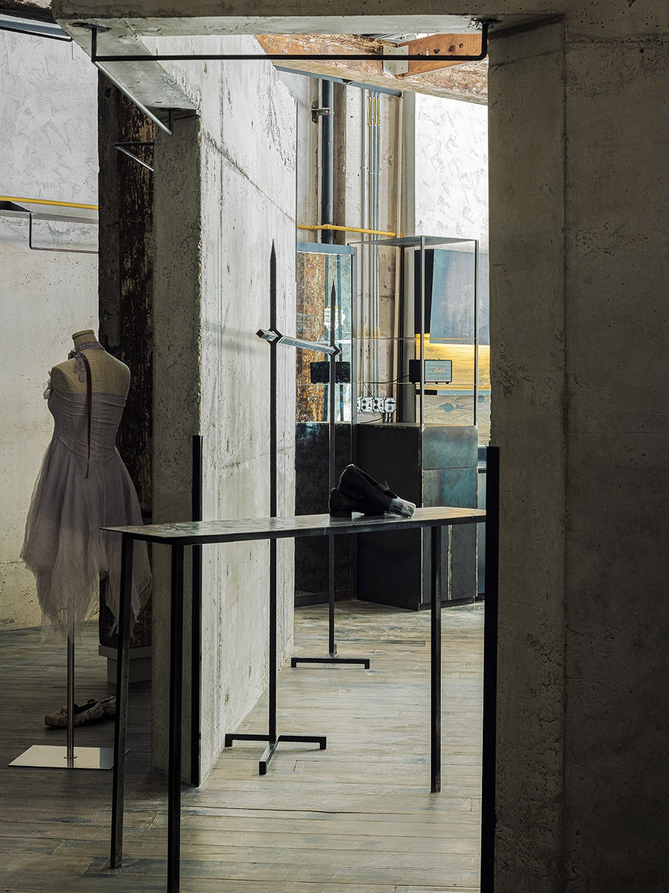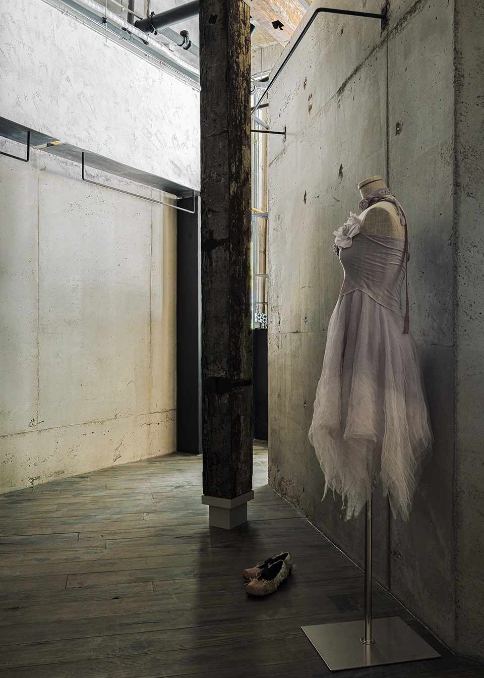 空间如服装,通过材质叠穿来表达性格。清水混凝土为基底,是利落的黑白暗调,是独立女性冷静坚韧的外在。老旧木板铺地,是温暖的触感,延续着品牌工作室的熟悉记忆。老梁木构架于顶上,如同为冷静的空间披上一件温暖的外套,形成强烈的视觉与情感反差。