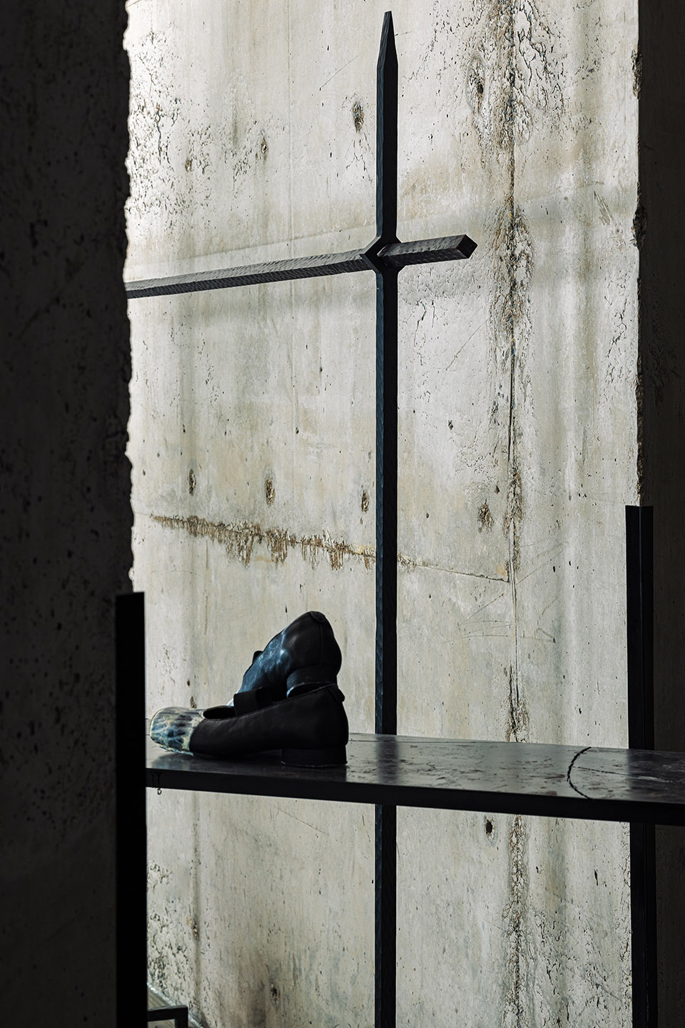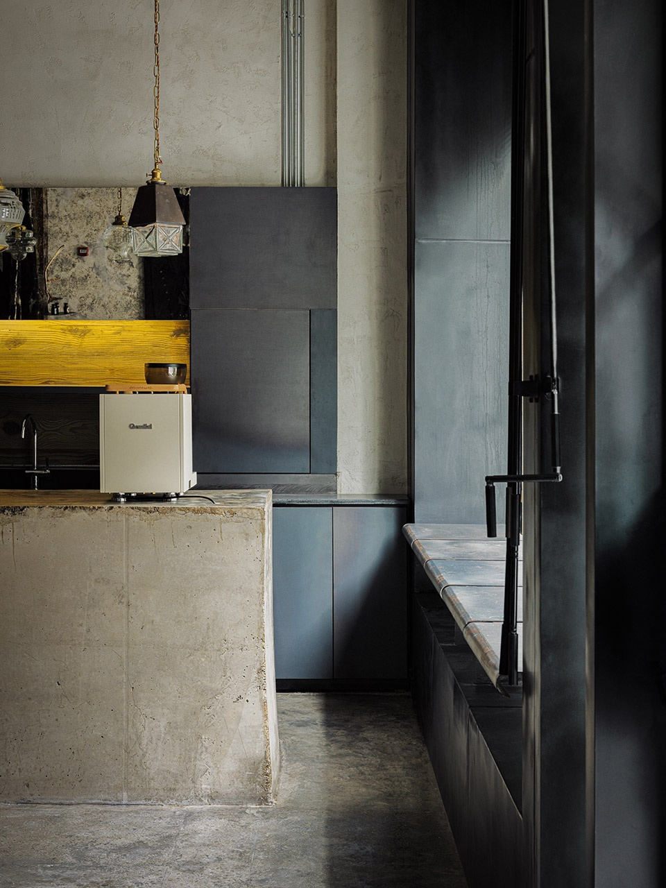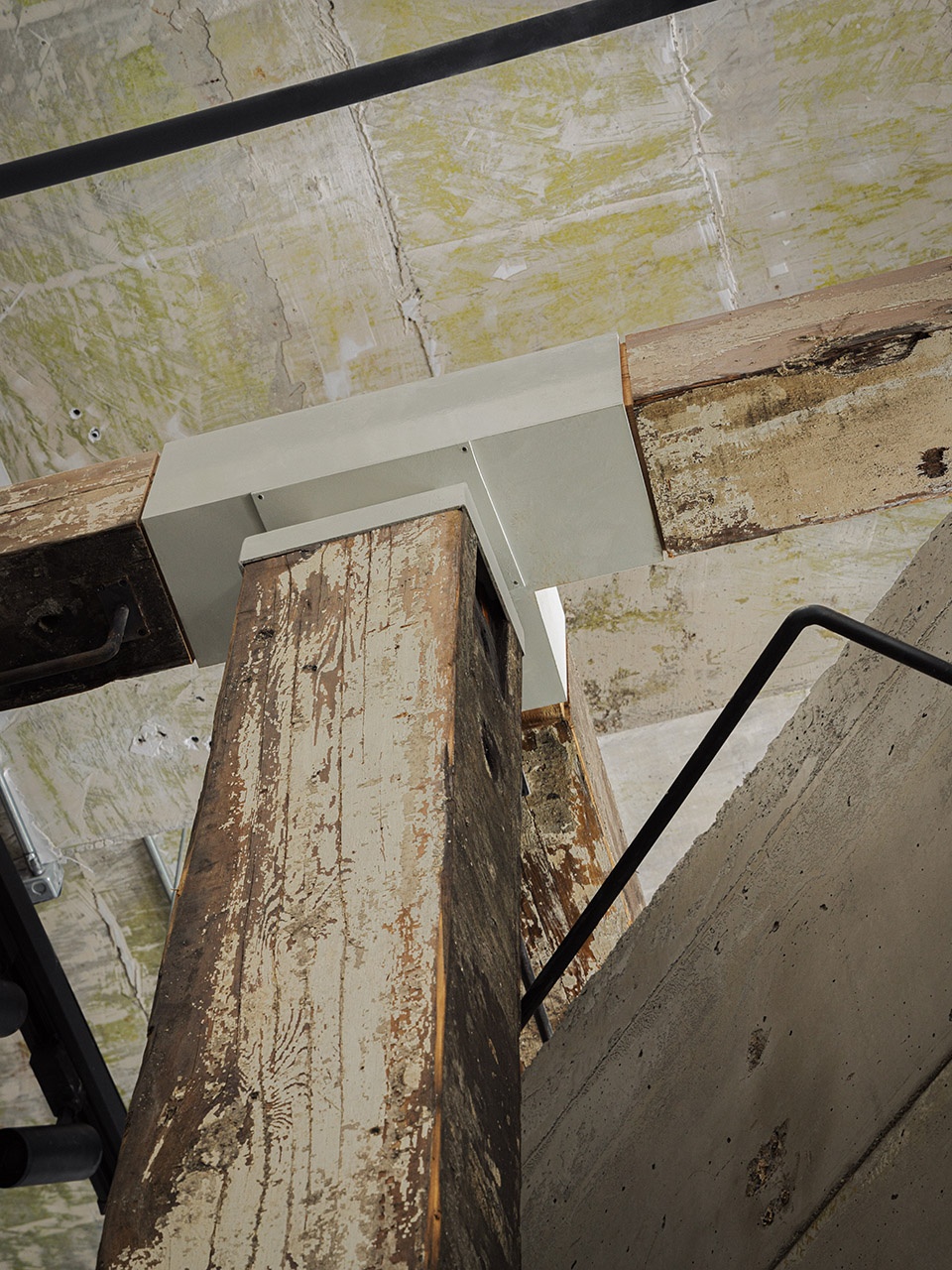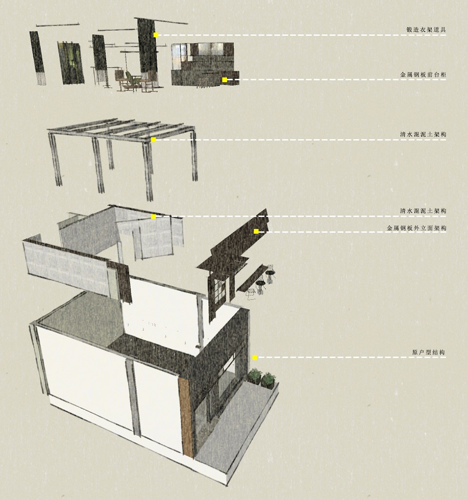 Materials | Iron plate, clear water concrete, textured coating, old wooden beam