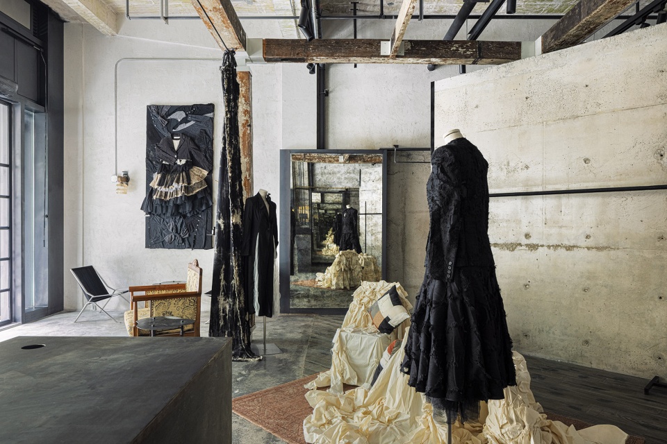 Space is like clothing, expressing personality through material layering. Based on plain concrete, it has a sharp black and white tone, and is the calm and tough exterior of independent women. The old wooden flooring provides a warm touch, continuing the familiar memories of the brand studio.The old beam wooden structure stands on top, like a warm coat draped over a calm space, creating a strong visual and emotional contrast.