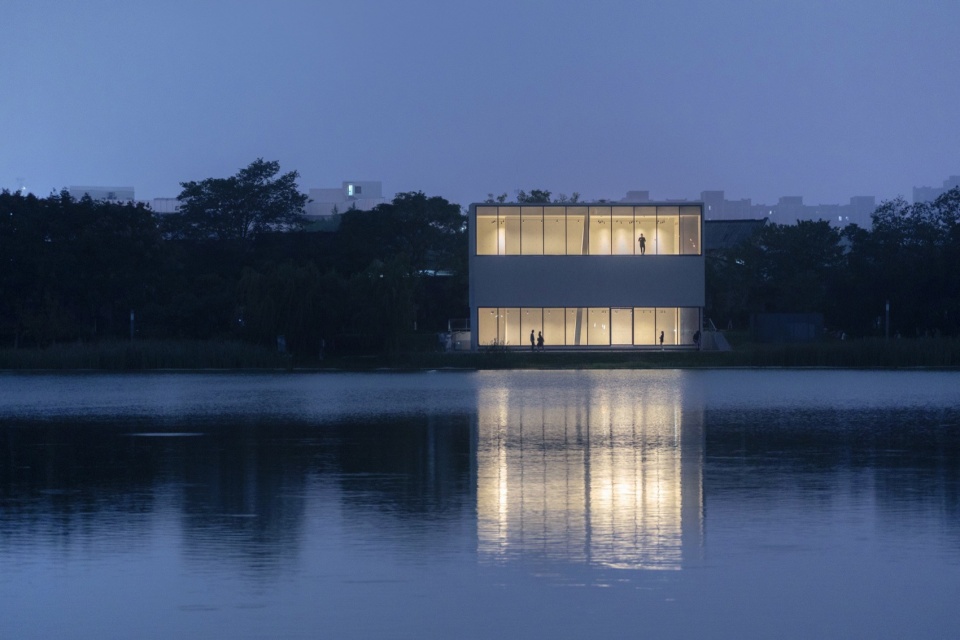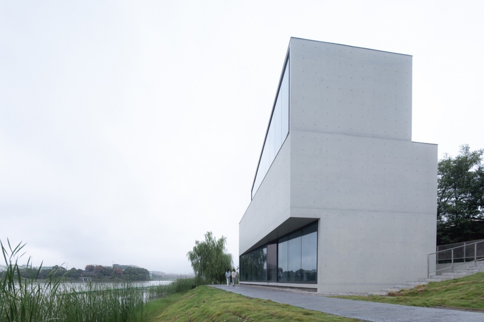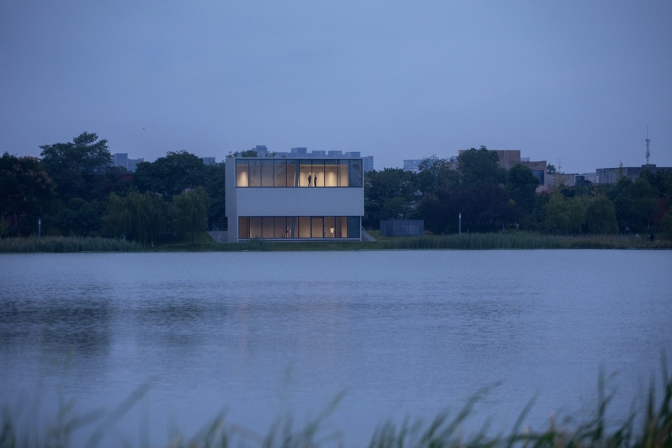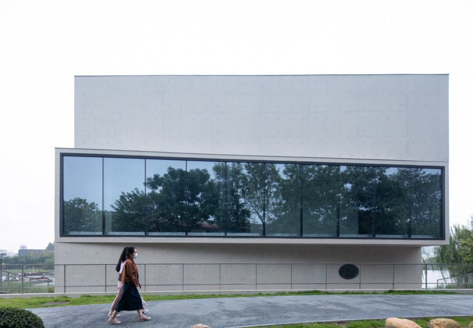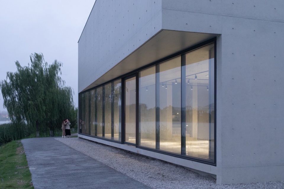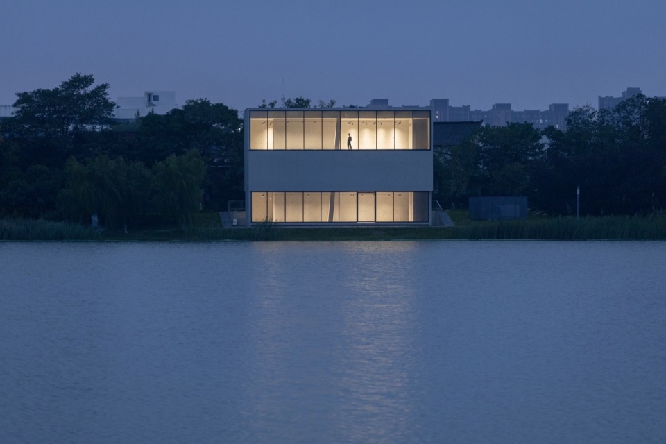 作为湖边小体量建筑,设计未采用拟态自然的手法,而是以理性、人工化的几何形态与自然环境形成反差的对比。这种具有明确几何导控的建筑体量,介入自然驳岸乃至步道系统中,展现出理性建构与自然法则的殊途同归。