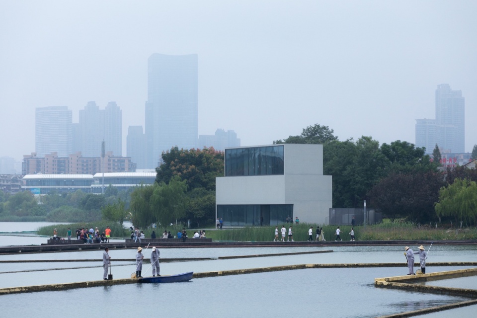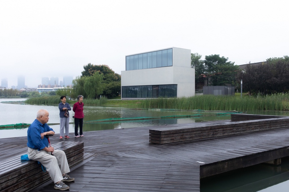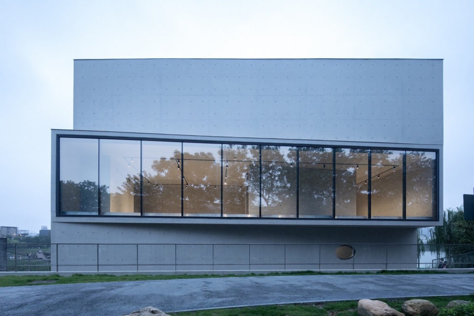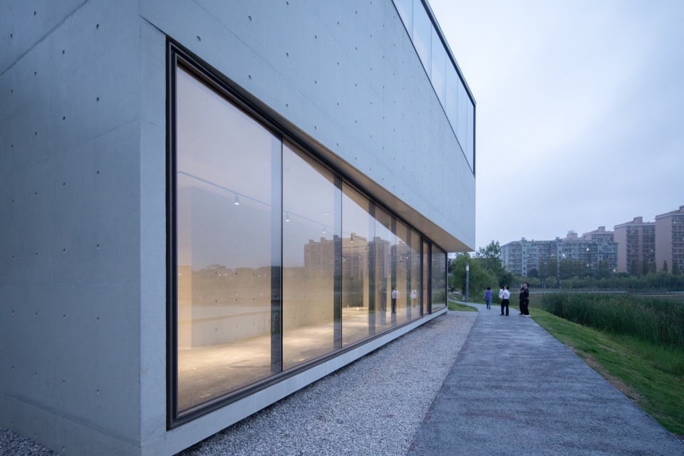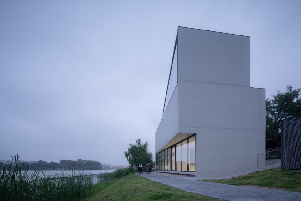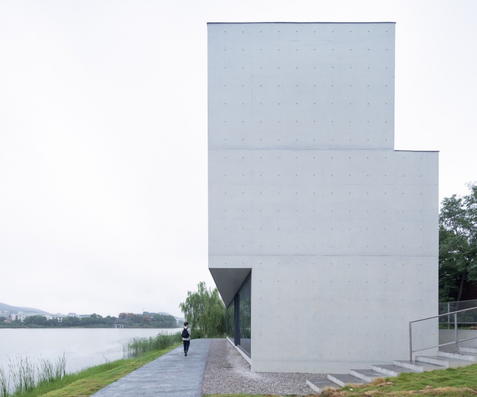 作为湖边小体量建筑,设计未采用拟态自然的手法,而是以理性、人工化的几何形态与自然环境形成反差的对比。这种具有明确几何导控的建筑体量,介入自然驳岸乃至步道系统中,展现出理性建构与自然法则的殊途同归。