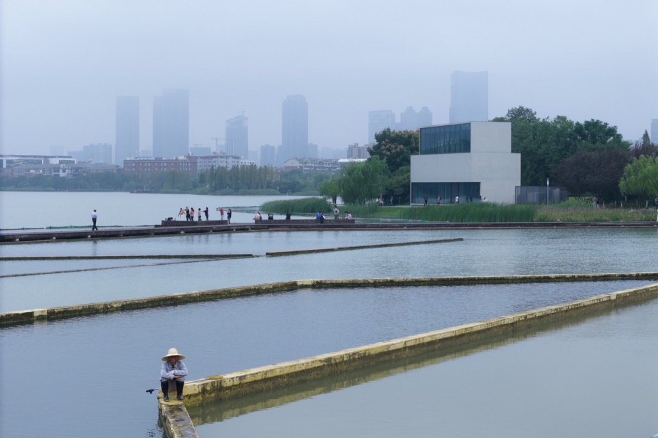 因此,设计通过设置一个具有标识性的建筑,反向整合原本零散、可识别性弱的岸线结构,起到聚焦与凝练的作用,进而增强环湖步道的整体归属感。