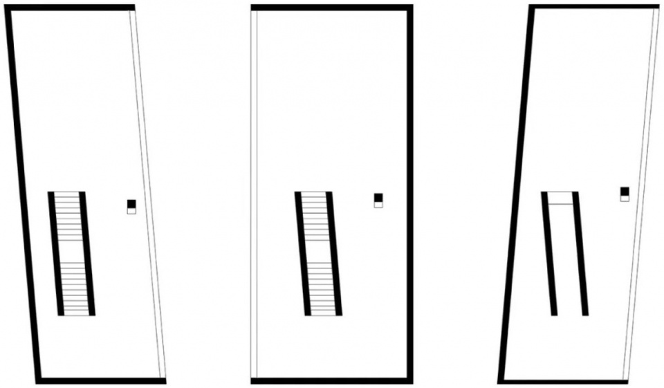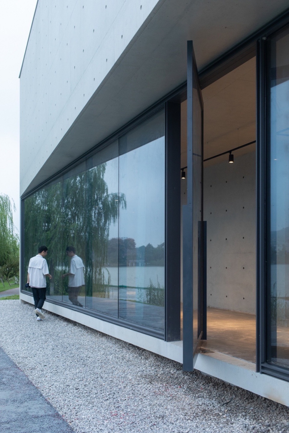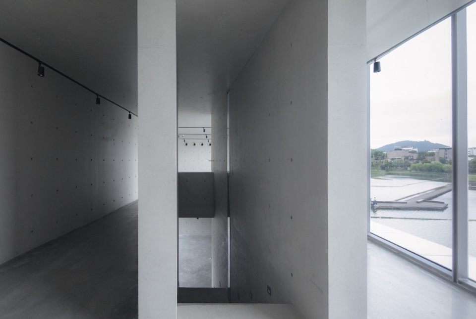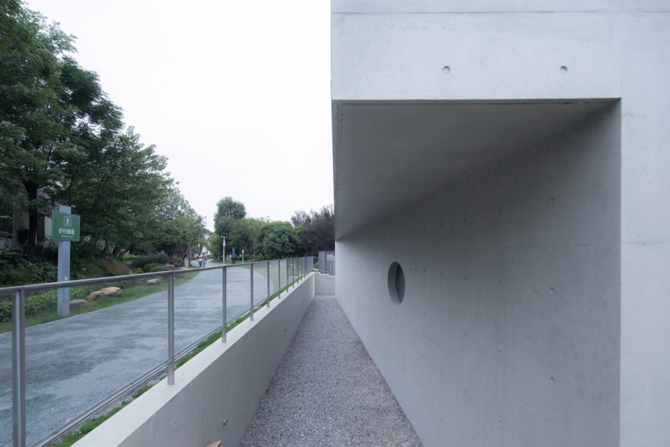 Despite its small scale, the building is presented as a unified form. The elevation adopts a tripartite composition, with each segment rotated in relation to the revetment and the direction of the path, generating subtly shaped in-between spaces and visual corridors that allow the building to almost merge with its surroundings. Visitors, whether viewing from across the lake or passing by on foot or while jogging, can experience a natural interactive relationship between the building and its environment—like a “zipper” that “stitches” together previously disconnected environmental elements.