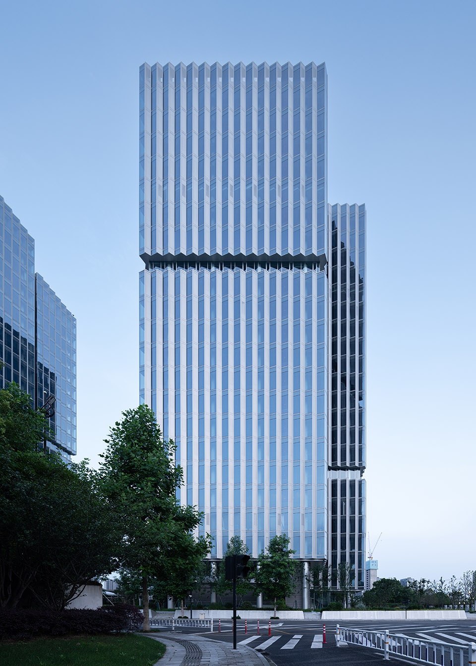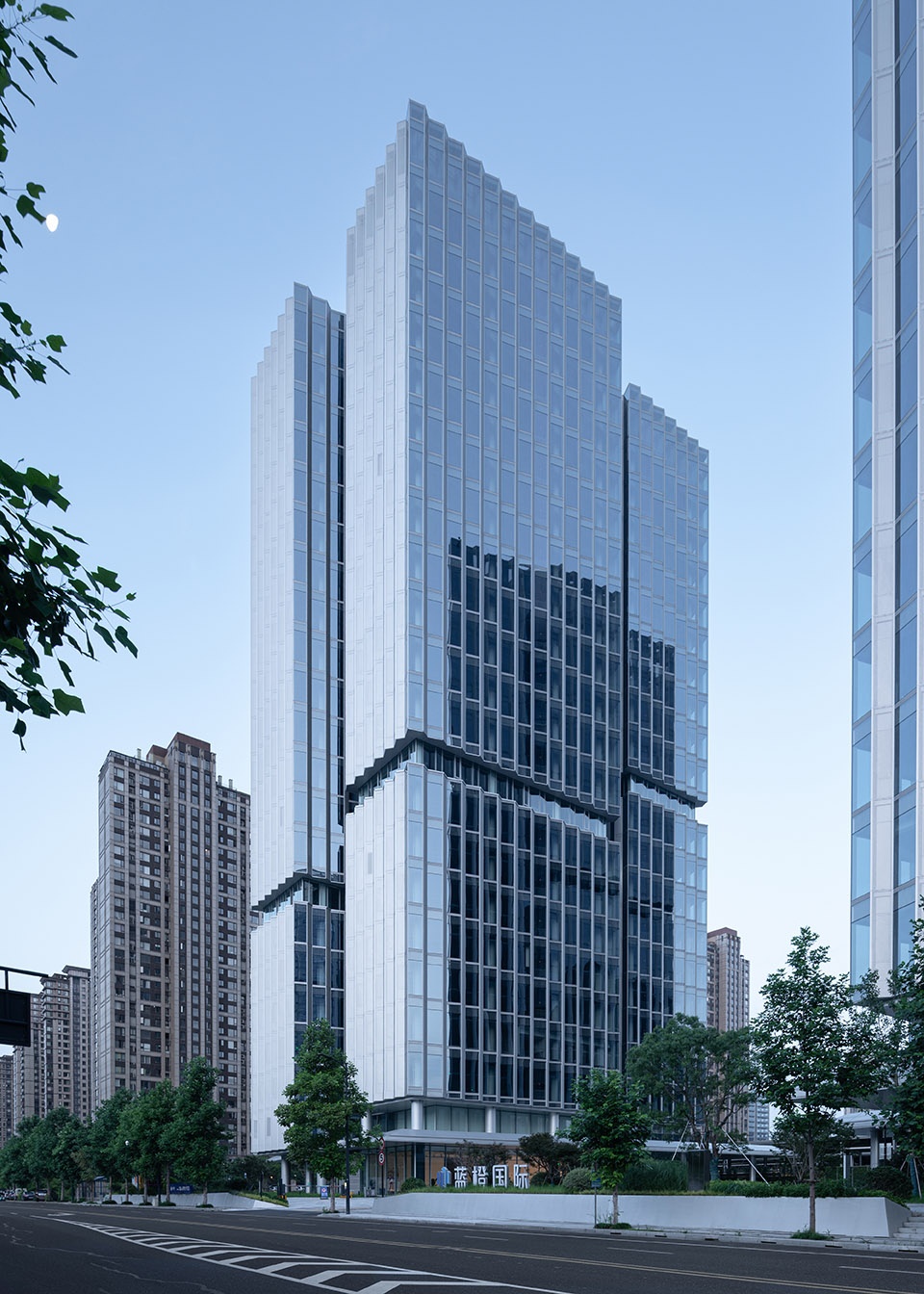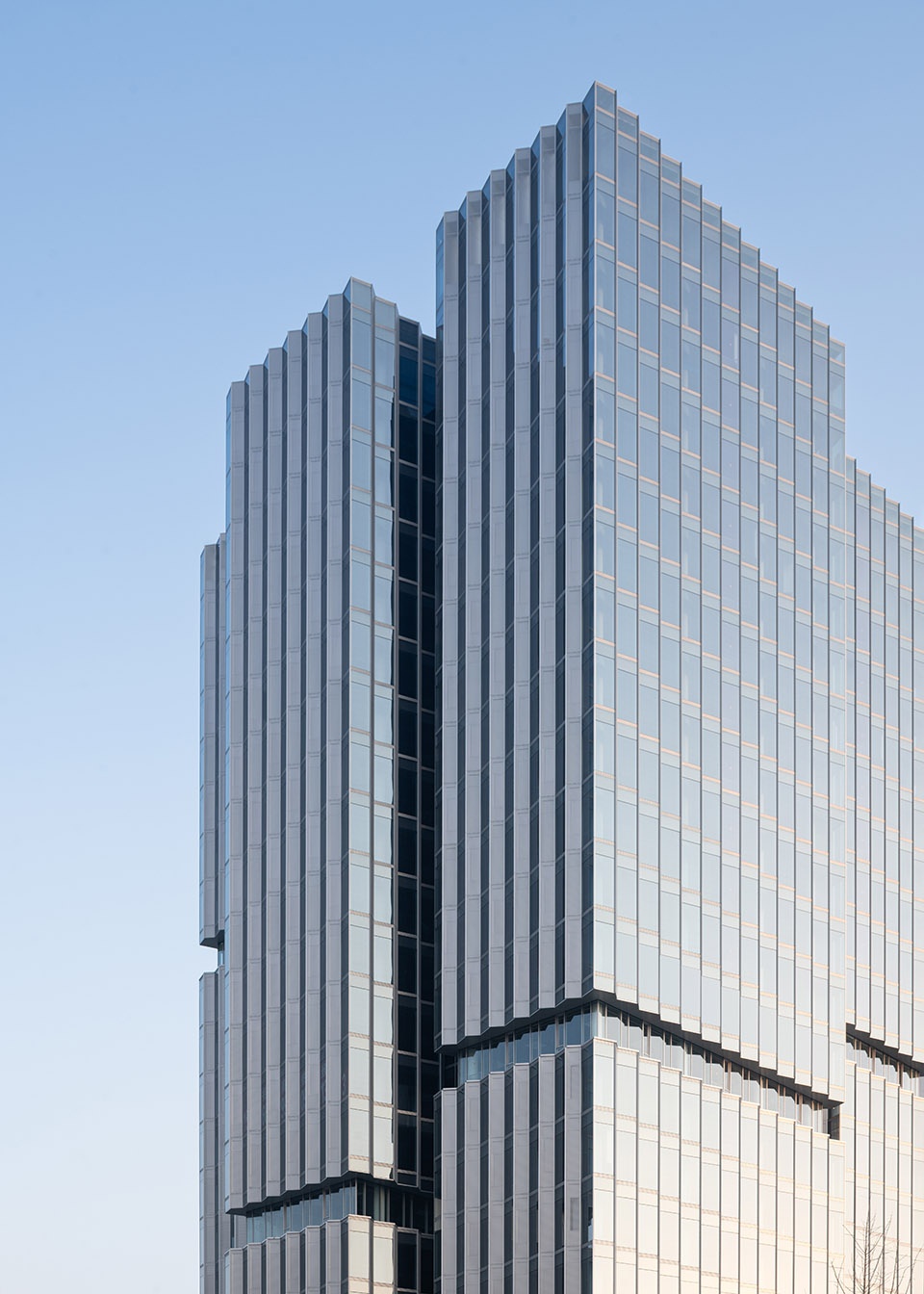 错动的体块也改变了同尺度下规整板楼的视觉宽度,让建筑显得修长、挺括。重复排列的虚实相间的锯齿状幕墙单元,不仅解决了室内采光、通风等使用需求,也进一步拉长了立面视觉比例,并让建筑呈现“步移景异”的动态形式。