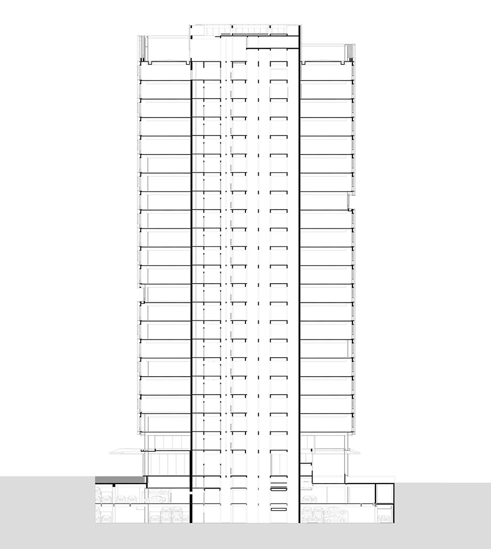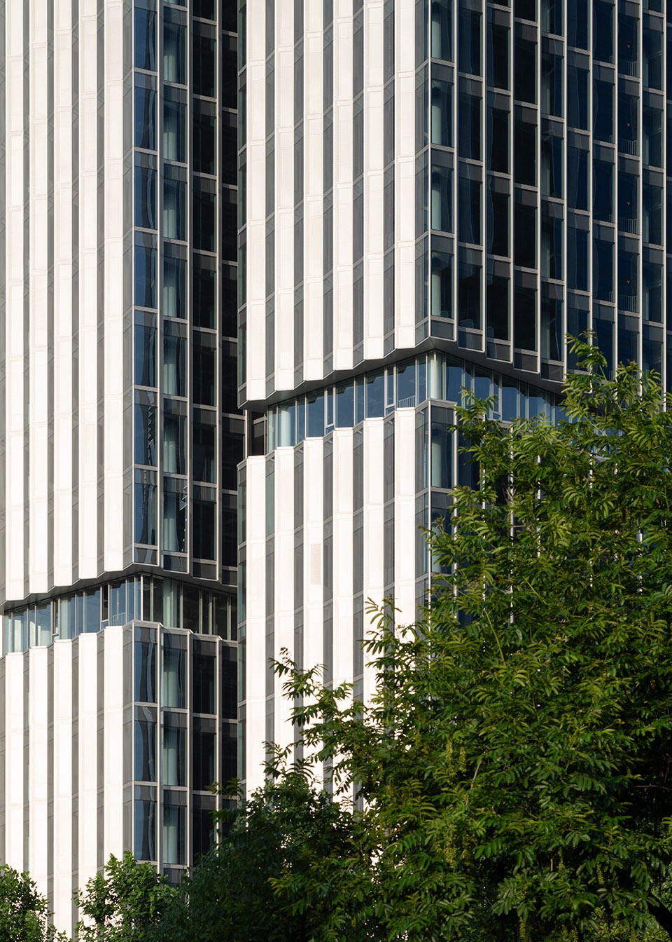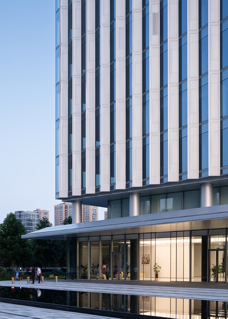 错动的体块也改变了同尺度下规整板楼的视觉宽度,让建筑显得修长、挺括。重复排列的虚实相间的锯齿状幕墙单元,不仅解决了室内采光、通风等使用需求,也进一步拉长了立面视觉比例,并让建筑呈现“步移景异”的动态形式。