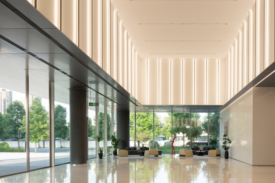 The offset building masses also change the visual width of a regular slab building of the same scale, making the building appear slender and neat. The repeated arrangement of zigzag curtain wall units with alternating solid and void sections not only meets functional requirements such as indoor lighting and ventilation but also further elongates the visual proportion of the facade, endowing the building with a dynamic form where “the view changes with every step.”