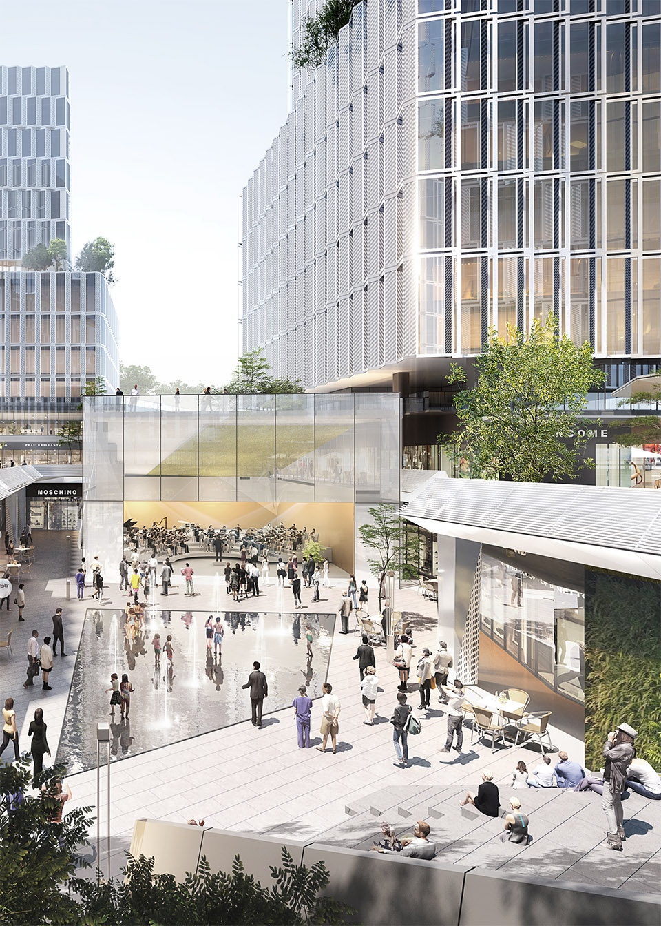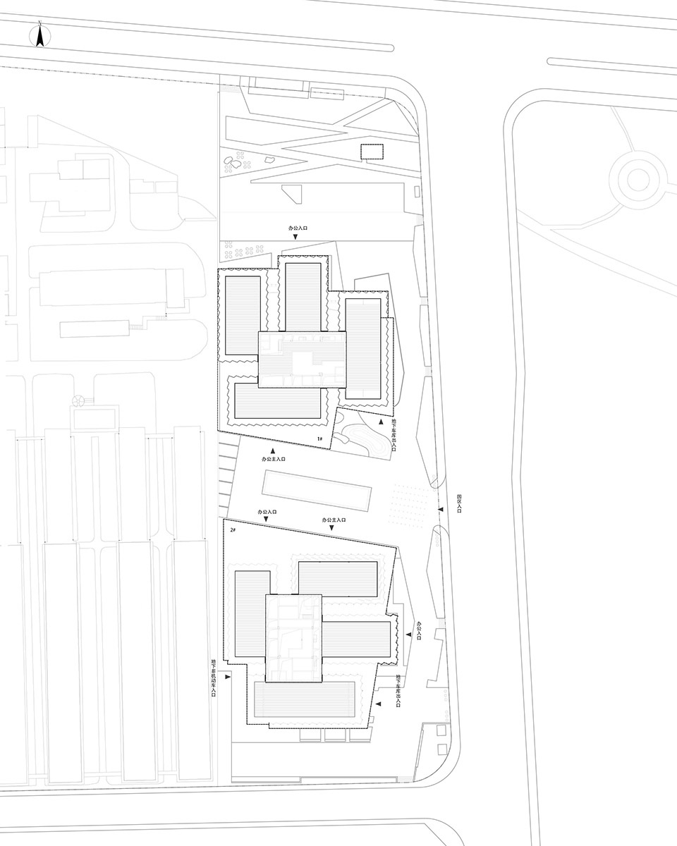 一期项目紧邻城市道路,主入口布局于两楼中间并形成贯通园区东西的广场。广场不仅将成为高效组织园区不同建筑与场所的主要交通空间,其大尺度、开放的空间特质也使其成为园区重要的公共活动空间,并与跟园区一街之隔的城市公园形成空间连续性,为城市提供了一个尺度适宜、安全的公共活动空间。而公园景观也因广场的视觉通畅性成为园区的一部分,提升园区景观品质的同时放大了园区的感知尺度。