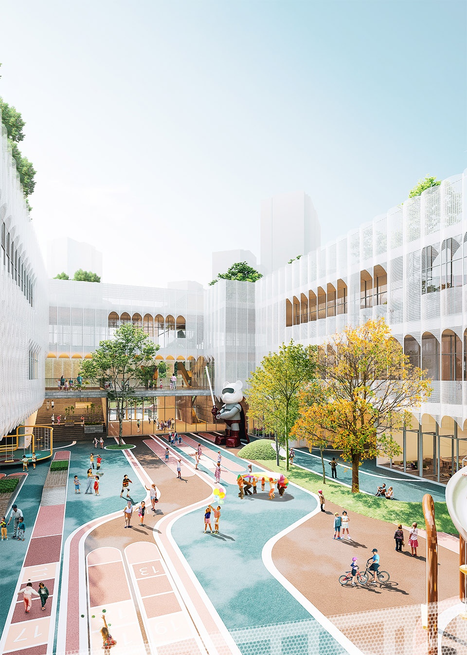 ▼左:留风轩项目(含 gad 总部大楼)右:四堡七堡 12 班幼儿园效果图(2023),gad Headquarters(left), The renderings of Class 12 kindergarten in Sibao and Qibao(right)