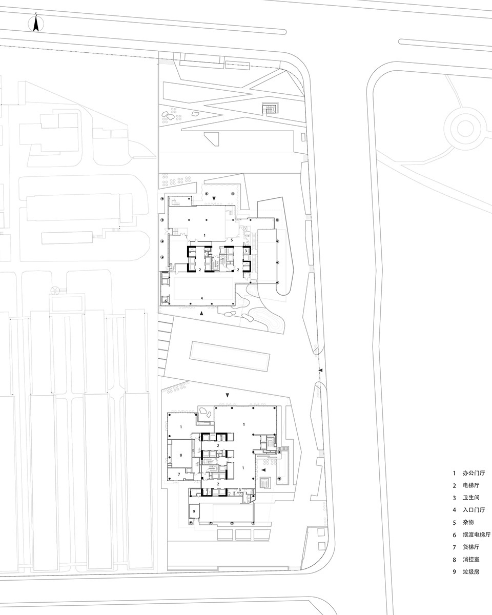 Phase I is adjacent to urban roads, with its main entrance positioned between the two towers, forming a plaza that runs east-west through the park. This plaza not only serves as the main circulation space for efficiently organizing various buildings and spaces within the park but also, due to its large-scale and open spatial characteristics, acts as an important public activity space for the park. It forms spatial continuity with the urban park across the street from the park, providing the city with a public activity space of appropriate scale and safety. Meanwhile, the park landscape becomes part of the campus thanks to the unobstructed visibility of the plaza, which enhances the landscape quality of the park while expanding the perceived scale of the campus.