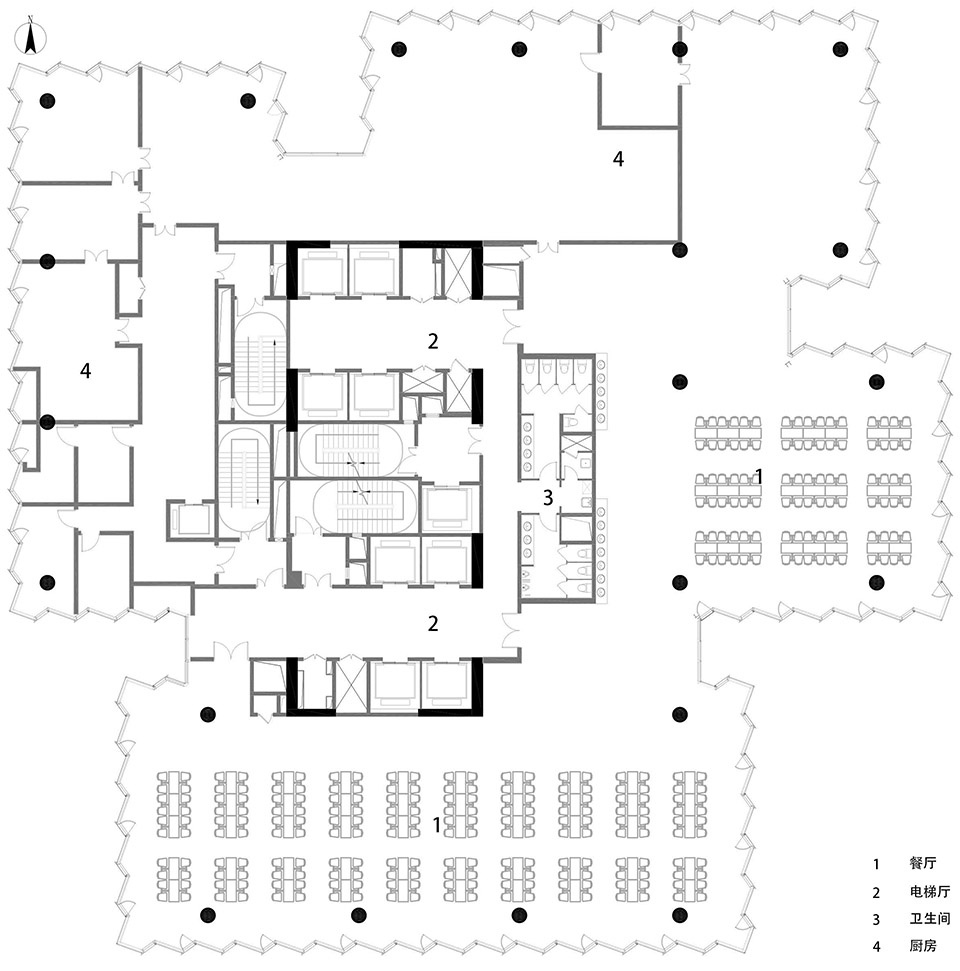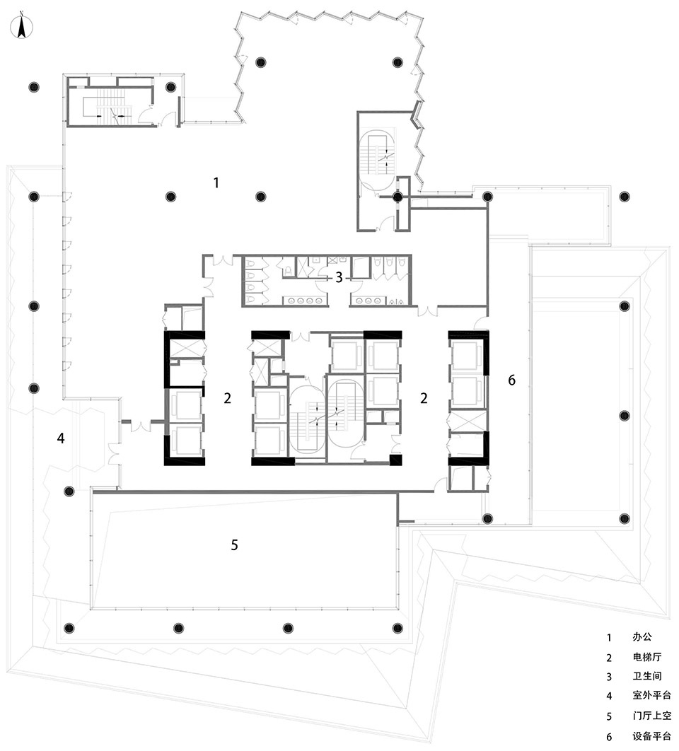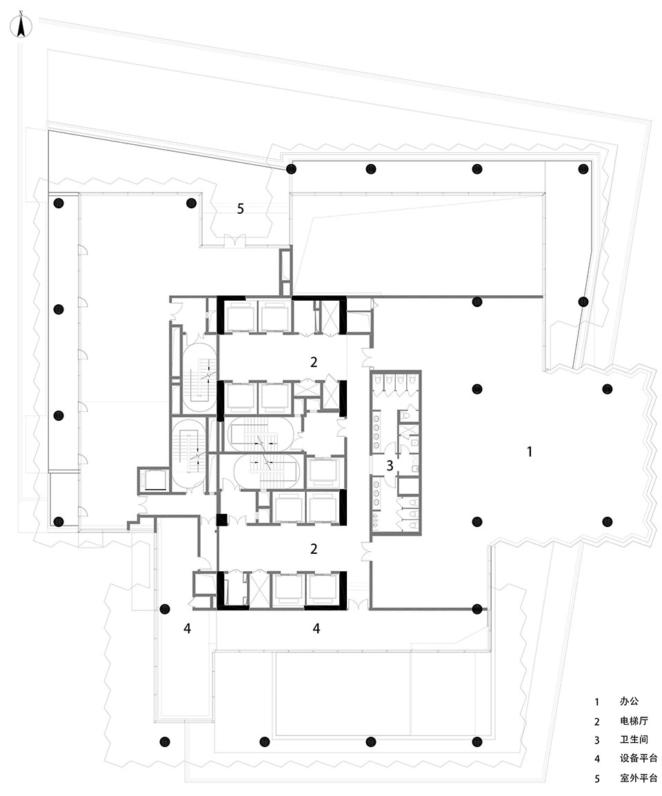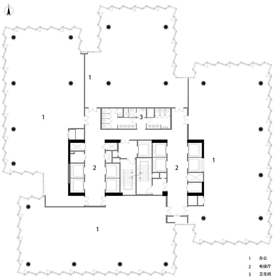 我们通过设计“可灵活分隔的办公模块”的方式,让办公空间能匹配多样的租赁需求。面积约1850㎡的标准层平面被分隔成四个规整且可分合的空间,设计通过建筑体块的分割、错动,让四个独立空间都拥有三面采光的景观视野。
