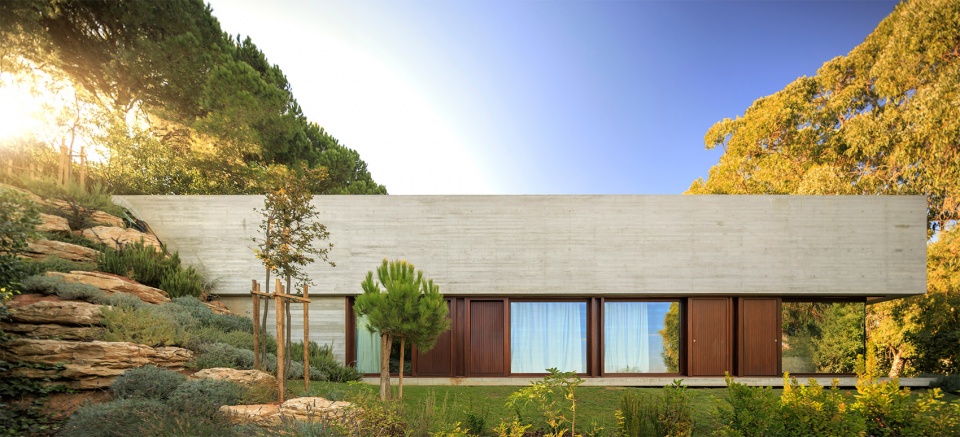 The static horizontality of the transversal section is animated by diagonal cross movements, and is generated by different transparencies confirmed by the negative of the sloping and accessible roof. This is due to the topography that adds dimensions and uses to the roof that prolong the narrative of the house. The materiality adopted goes through the closings of the house and confirms this total and global dimension. The architecture appears, as always, transformative, but also capable of adding stability and quality to the place.