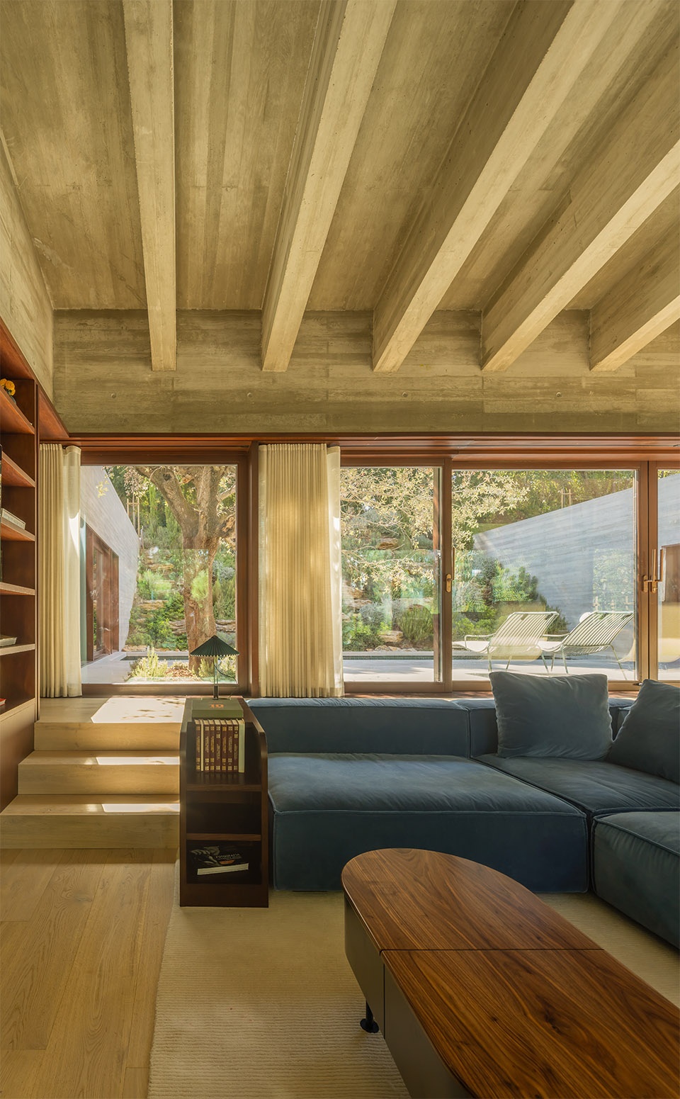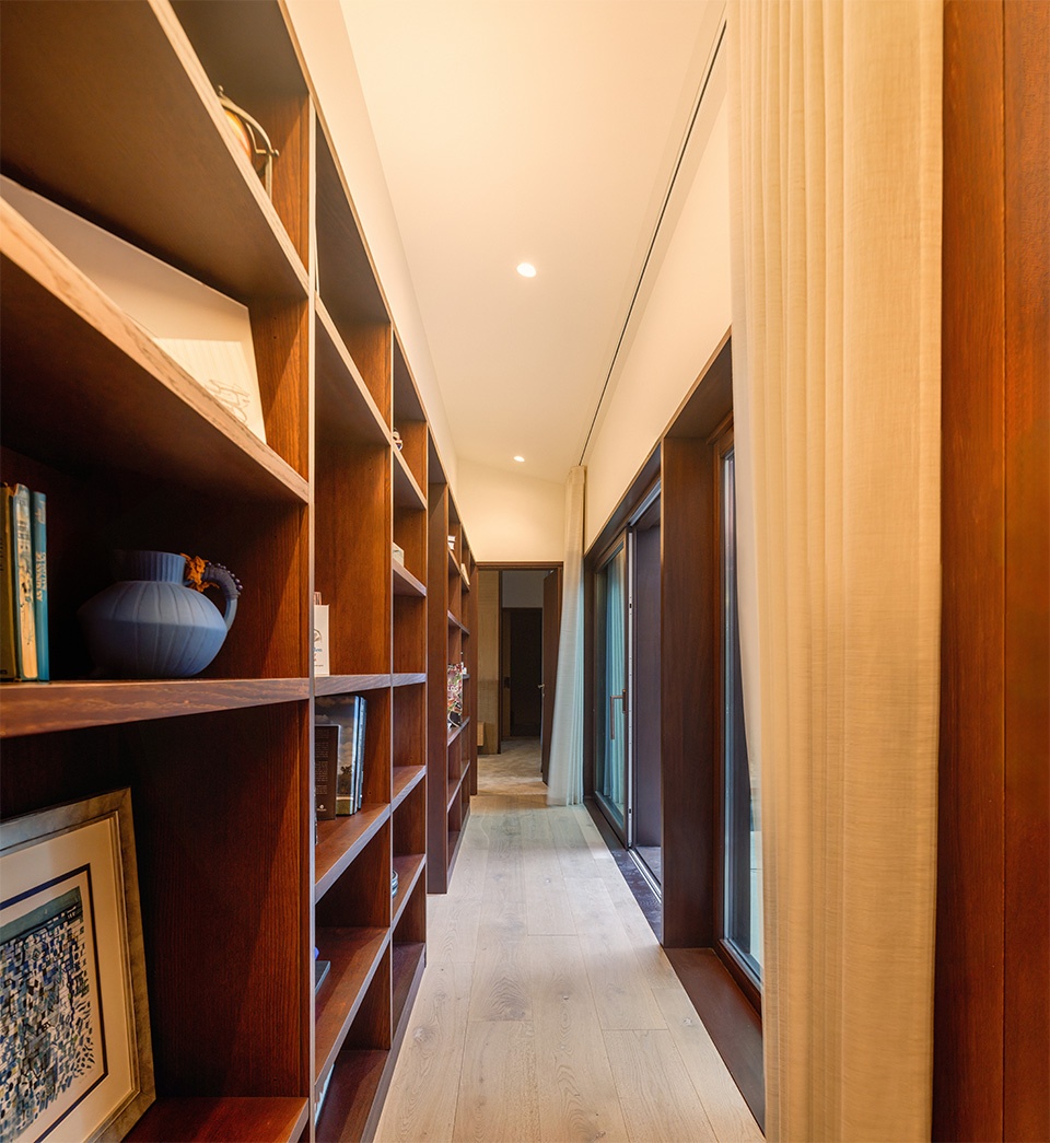 项目横断面呈现出的的静态水平感因对角线的交错动势而被激活,进而形成不同层次的透明性,而这种透明性由倾斜且可通行屋顶的“负形”所确证。正是地形赋予屋顶更多维度与功能,从而延展了住宅的叙事。所采用的材料贯穿整个建筑围护体系,也进一步强化了项目的整体性与全局感。建筑在此展现出一贯的变革性,同时也为场地带来稳定与品质。