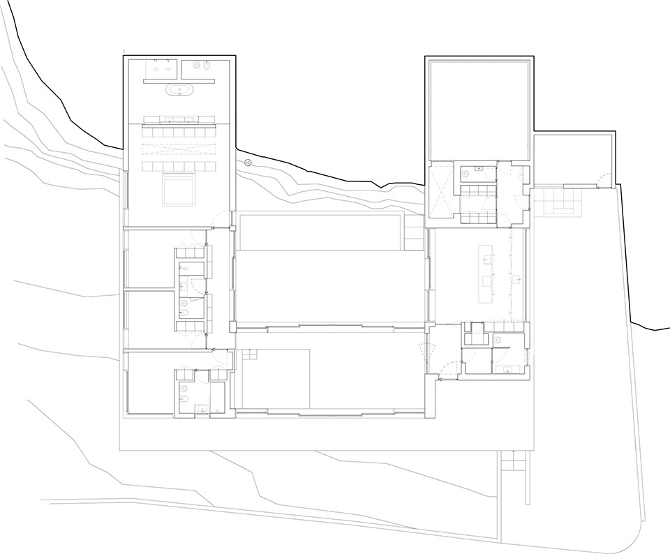 A water feature as a scenic pool compensates for the lighting and the half-buried condition of the entrance patio. The central void is formed by three sides that are diluted in the terrain, one with social uses and the other with individual uses, joined to the centre by a transparent and absent spatiality that dematerializes to articulate the entrance. Dense and strongly anchored on the slope, the mass levitates to let the soil flow and progress between the exterior and the centre of the patio, with the unity and continuity of the vegetation.