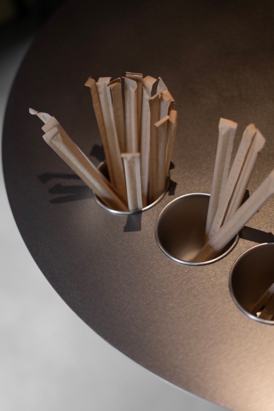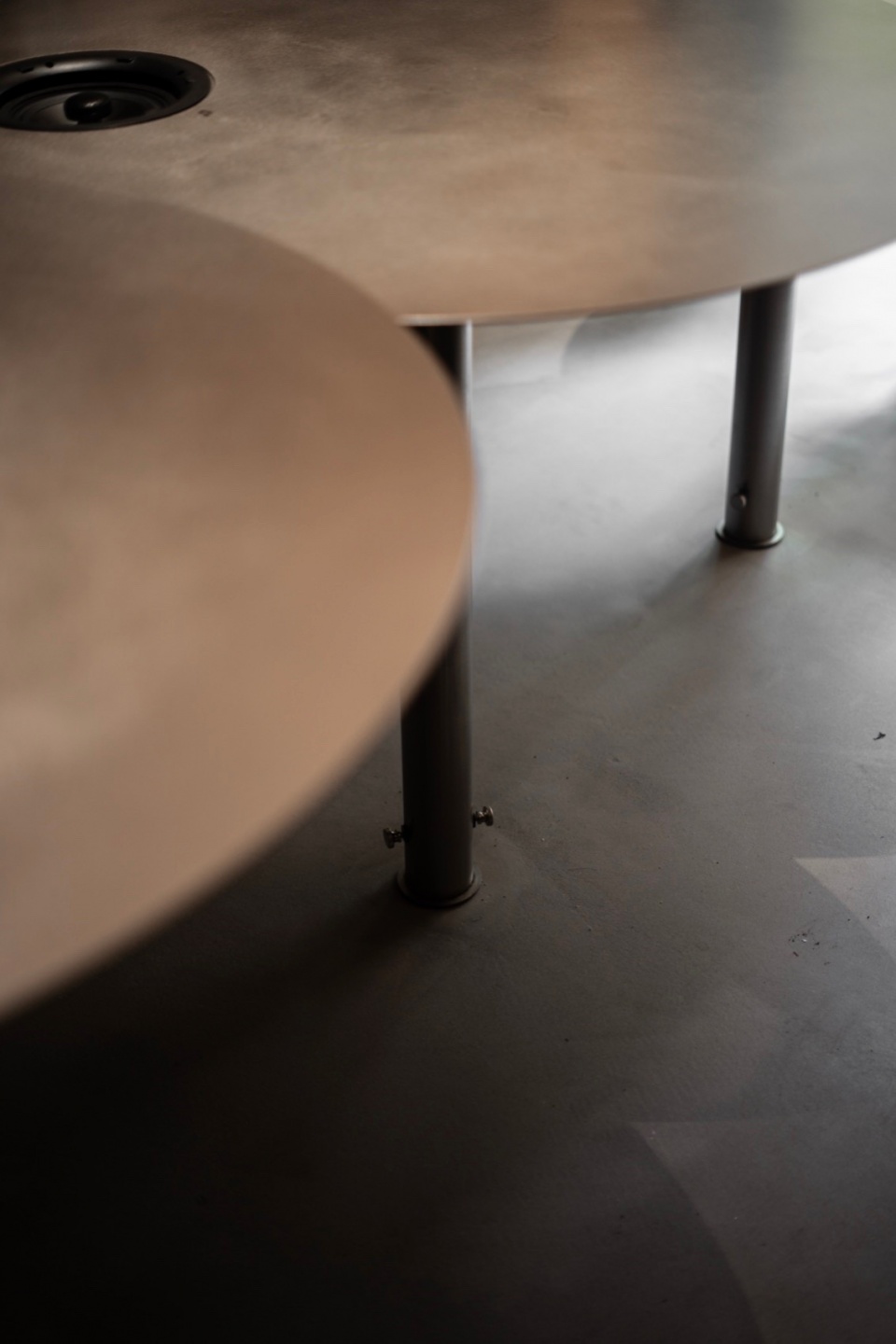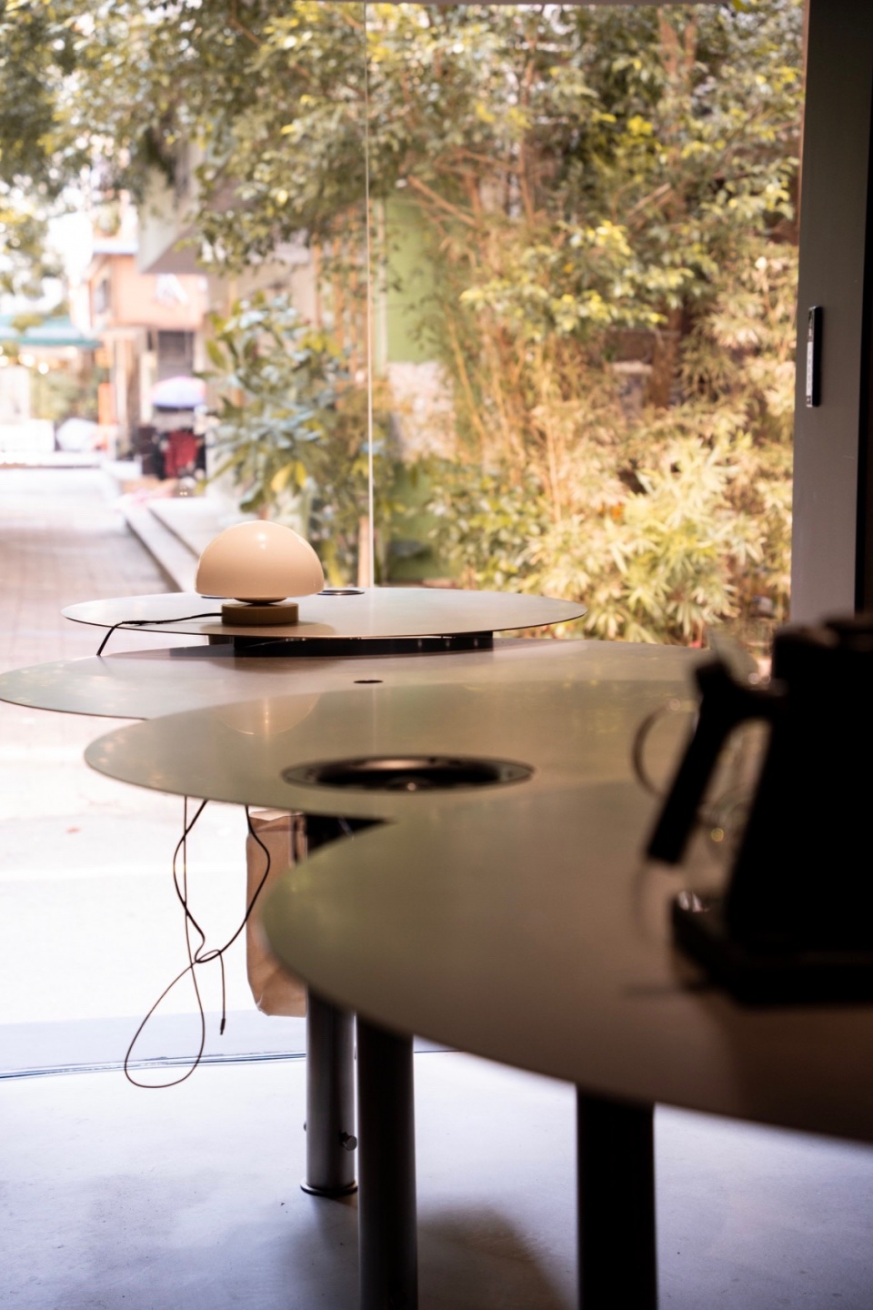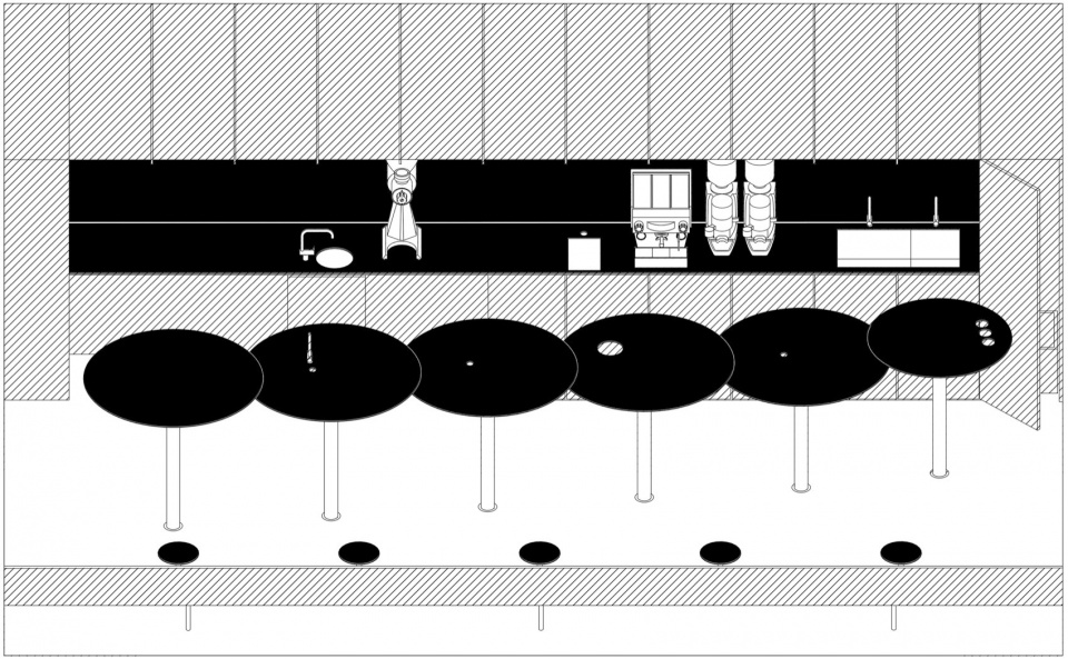 重新审视传统咖啡吧台的集合式习惯并将之解构,6个直径1200厚3mm的漂浮金属圆片各自承担:接待展示,收银,出餐,音响,手冲,直饮等功能,它像是一个由低到高呈阶梯布置的展厅,象征性地漂浮感轻薄暧昧又皮实耐用,重复相叠的正圆形台面层层高低依次排开,每隔3公分的高度间隔错落,形成叠加又交错的视觉节奏。
