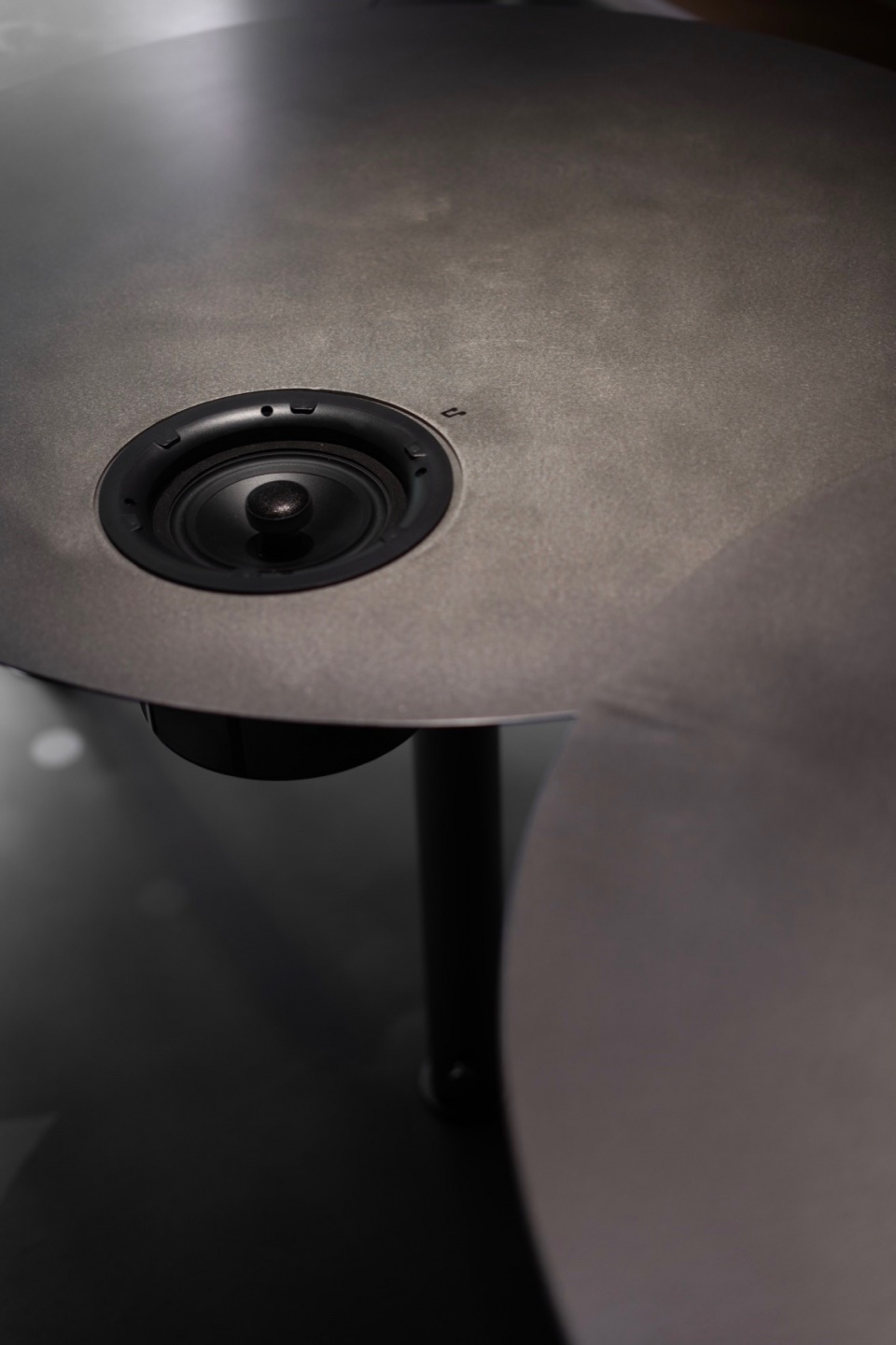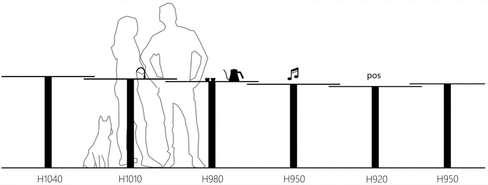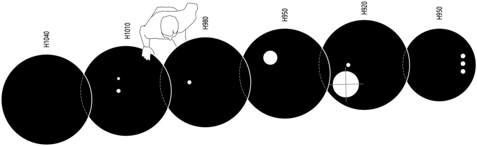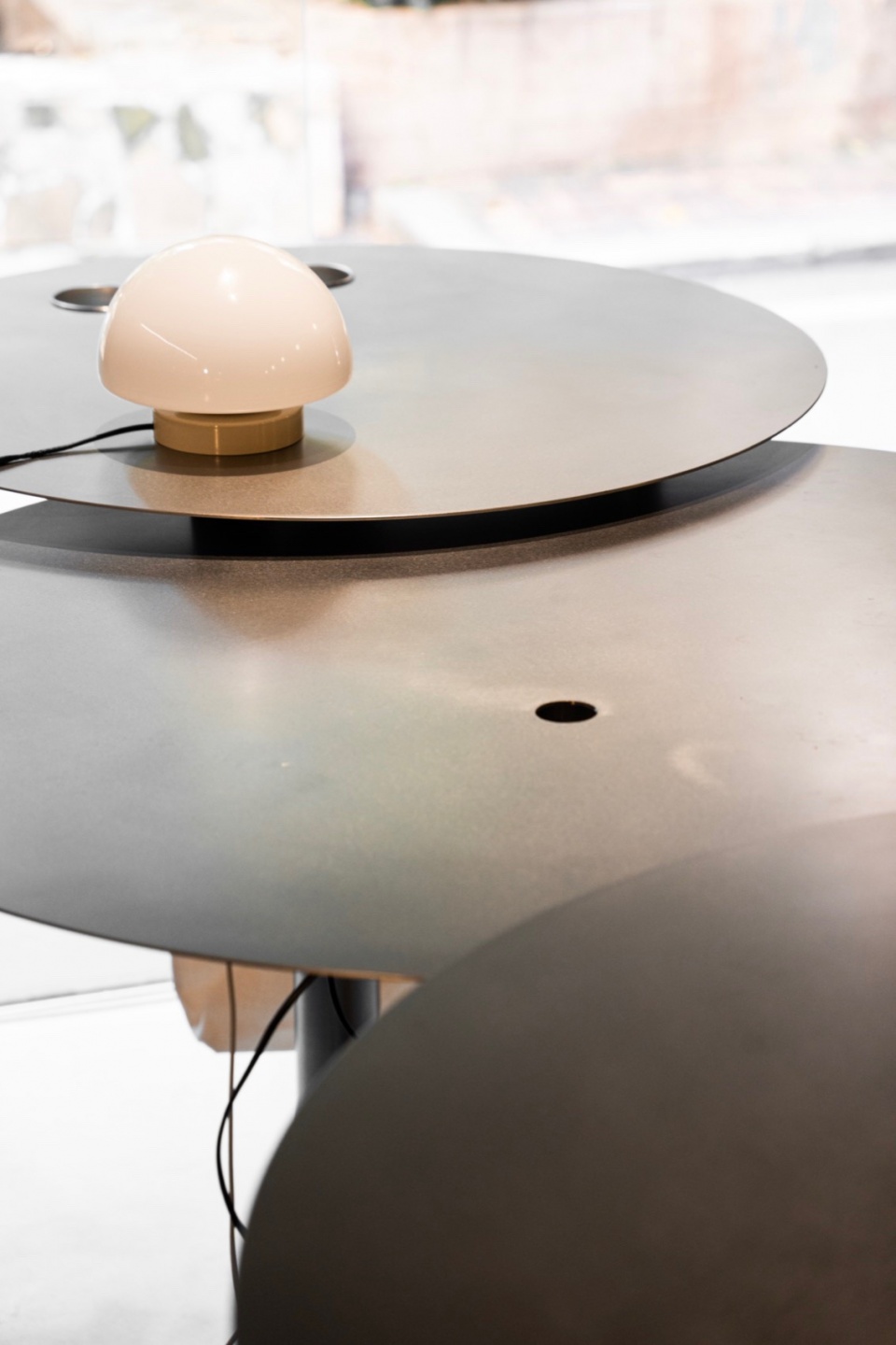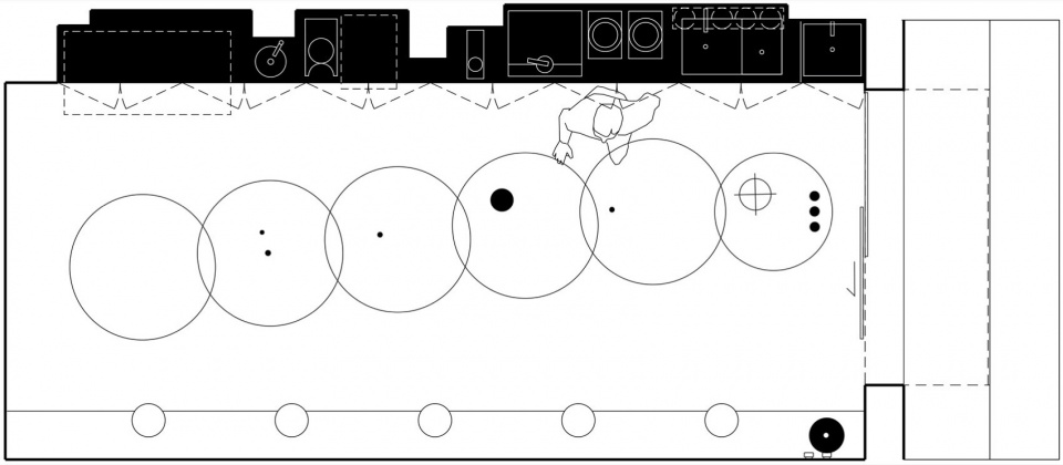 重新审视传统咖啡吧台的集合式习惯并将之解构,6个直径1200厚3mm的漂浮金属圆片各自承担:接待展示,收银,出餐,音响,手冲,直饮等功能,它像是一个由低到高呈阶梯布置的展厅,象征性地漂浮感轻薄暧昧又皮实耐用,重复相叠的正圆形台面层层高低依次排开,每隔3公分的高度间隔错落,形成叠加又交错的视觉节奏。