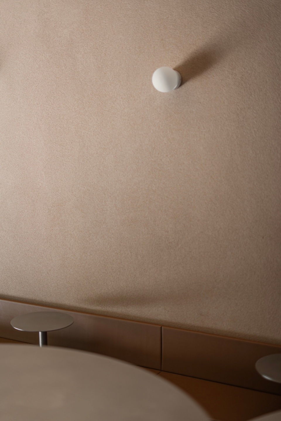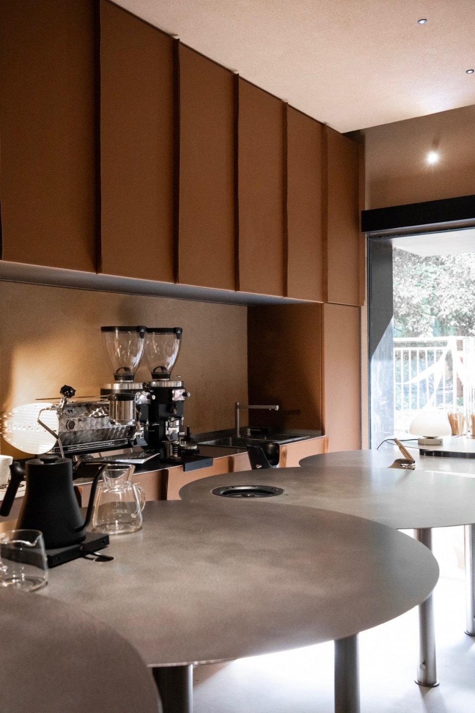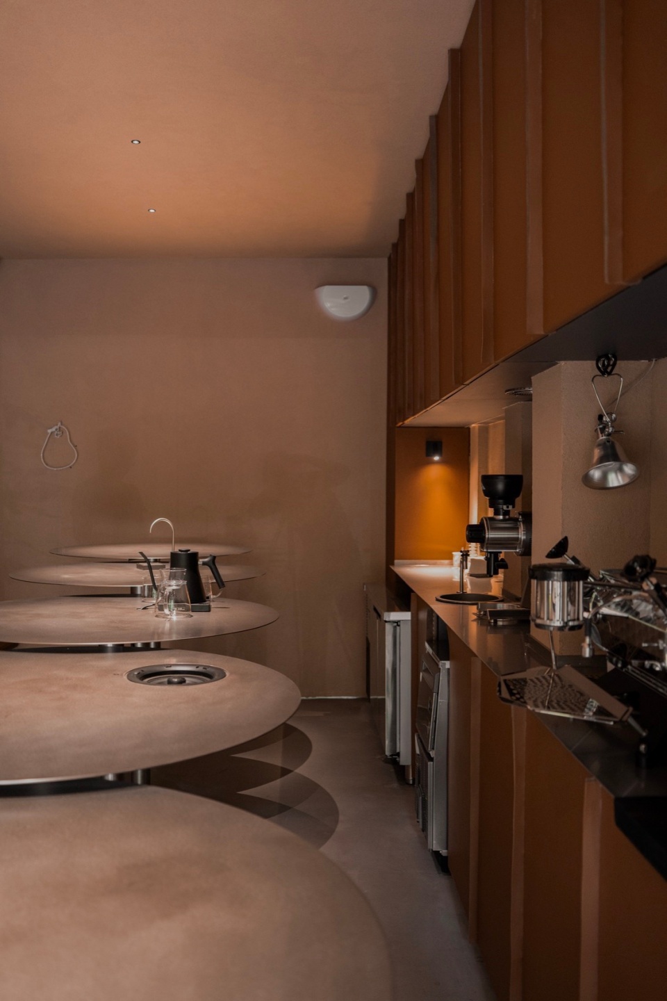 The spatial composition unfolds in two parts: To one side, a discreet storage wall camouflages existing structural elements, its streamlined cabinetry wrapped in soft camel-brown leather meeting operational storage needs. The counterpart on the other side dissolves into fluid interaction space where barista station and customer area coalesce, with six suspended metal discs floating in between, cascading in staggered elevations. Coffee making, casual dialogues, brewing rituals and spontaneous exchanges overlap across these circular platforms… Customers become immersed participants, witnessing operational transparency while absorbing the emotional cadence. The design orchestrates an uncanny intimacy – whimsical abstractions coalesce into spatial conversations where every element sustains, relates to, and elevates its counterparts!