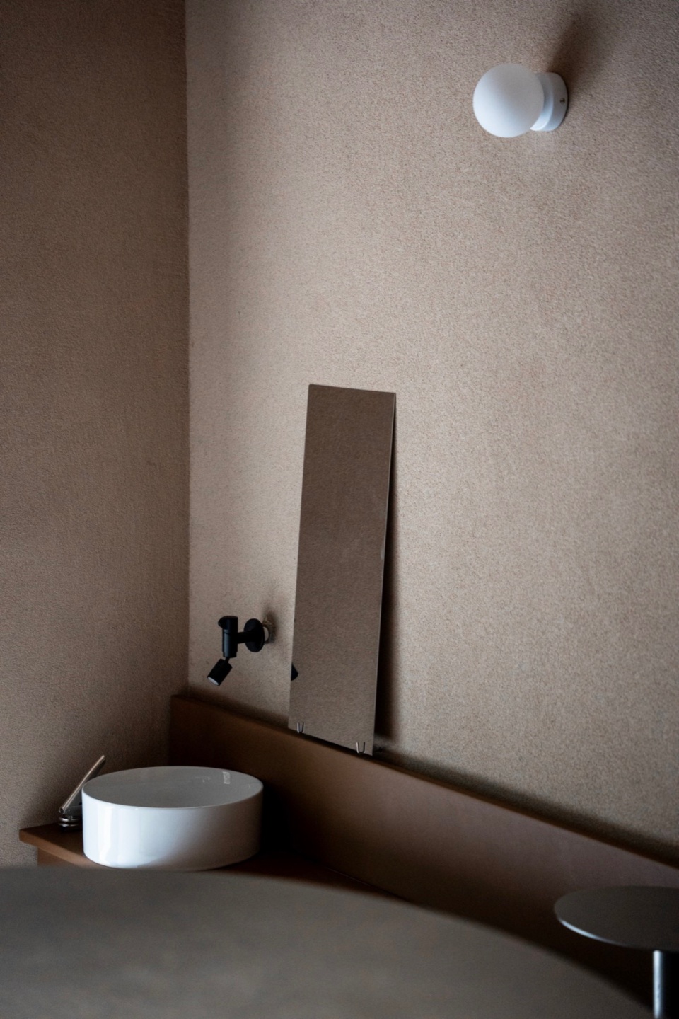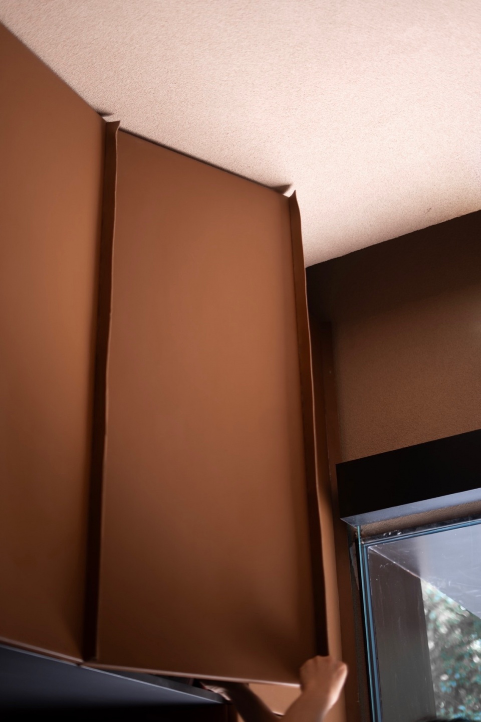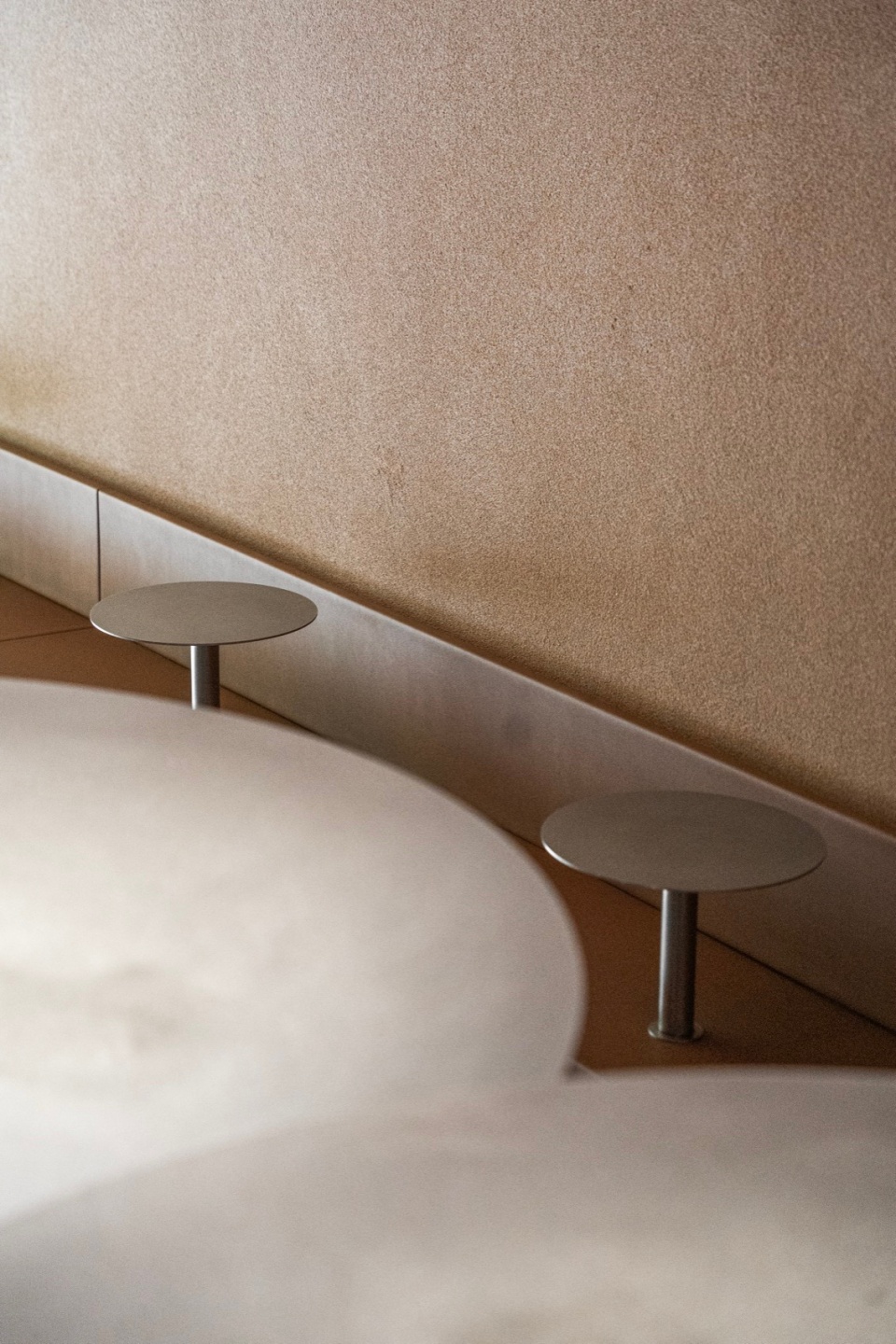 The spatial composition unfolds in two parts: To one side, a discreet storage wall camouflages existing structural elements, its streamlined cabinetry wrapped in soft camel-brown leather meeting operational storage needs. The counterpart on the other side dissolves into fluid interaction space where barista station and customer area coalesce, with six suspended metal discs floating in between, cascading in staggered elevations. Coffee making, casual dialogues, brewing rituals and spontaneous exchanges overlap across these circular platforms… Customers become immersed participants, witnessing operational transparency while absorbing the emotional cadence. The design orchestrates an uncanny intimacy – whimsical abstractions coalesce into spatial conversations where every element sustains, relates to, and elevates its counterparts!