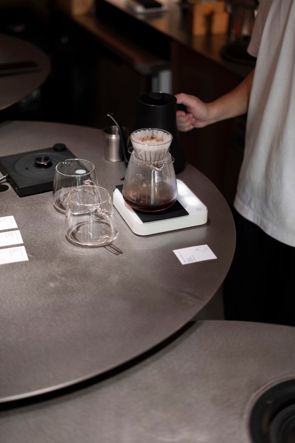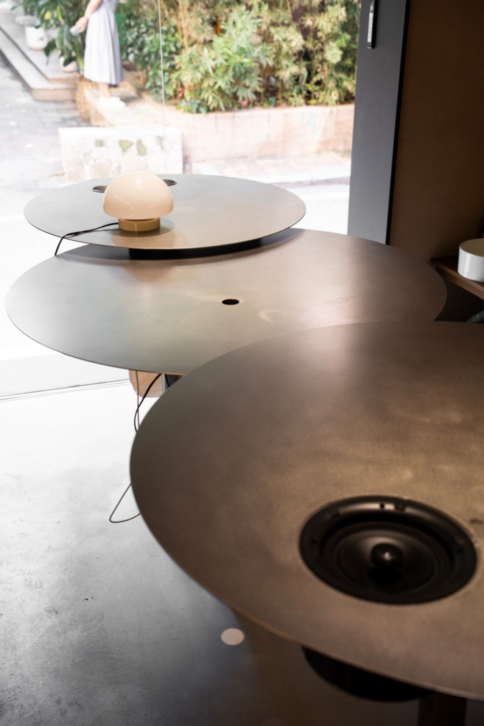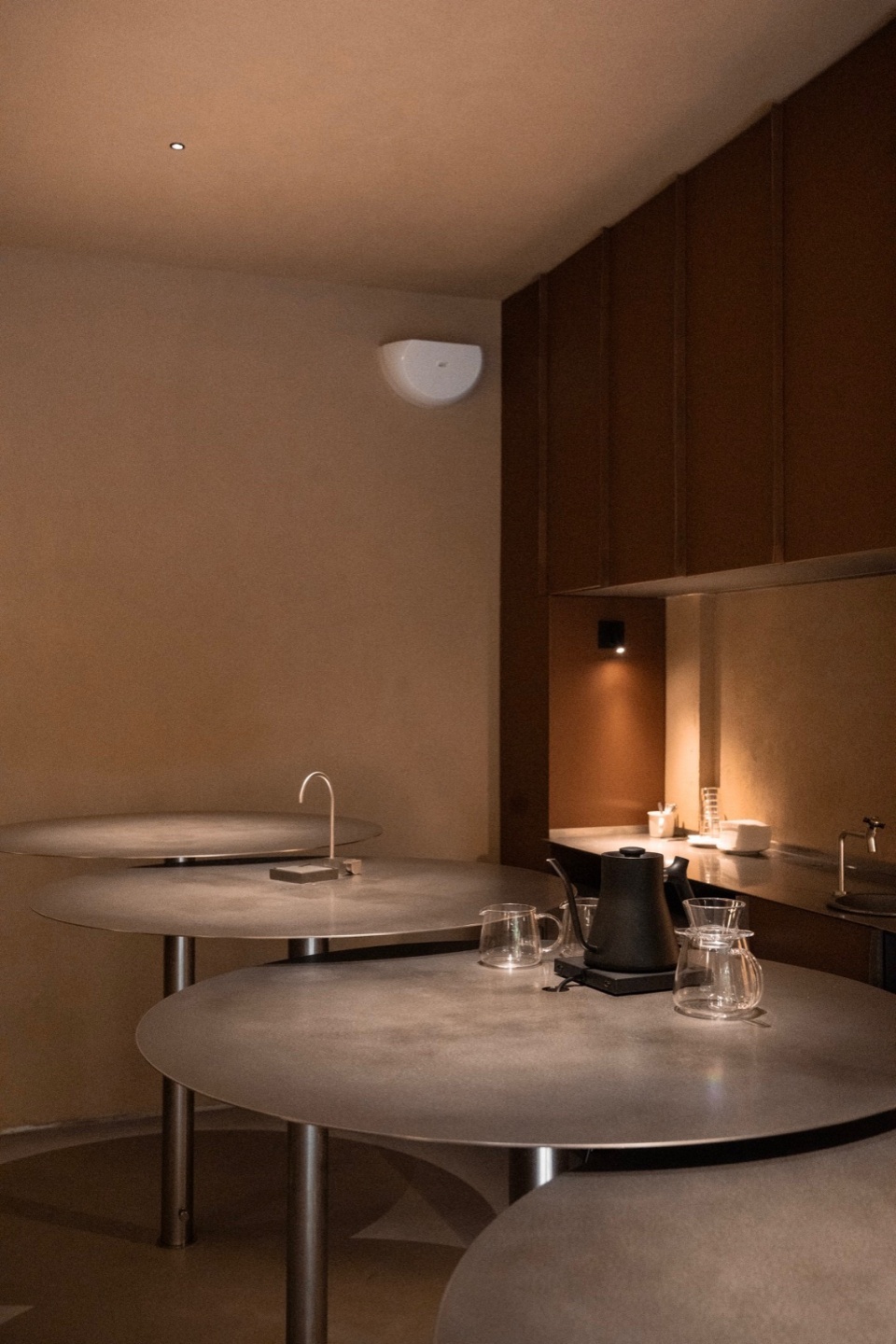 We have reimagined conventional coffee bar configurations through deconstructive design, with six levitating metal discs (Ø1200mm × 3mm thick) assuming distinct functions: reception/display console, payment hub, beverage counter, integrated sound system – while doubling as specialty stations for pour-over preparation and purified water access. Arranged in ascending tiers like a minimalist exhibition space, these precisely staggered circular platforms achieve paradoxical materiality through symbolic suspension. Stacked at 3cm intervals, this design creates rhythmic visual cadence through overlapping geometries.