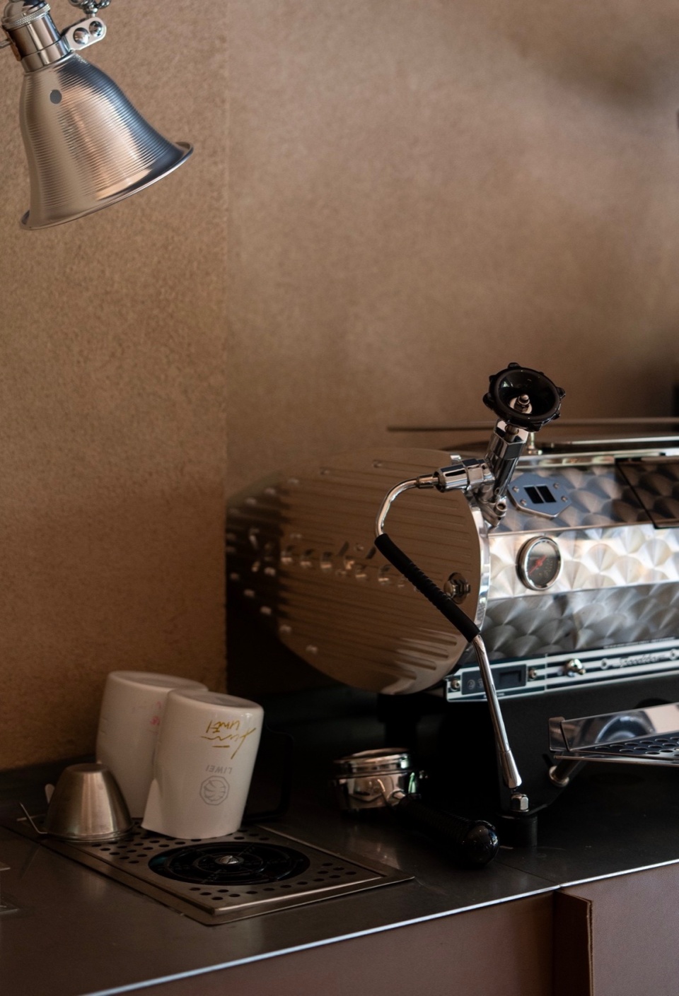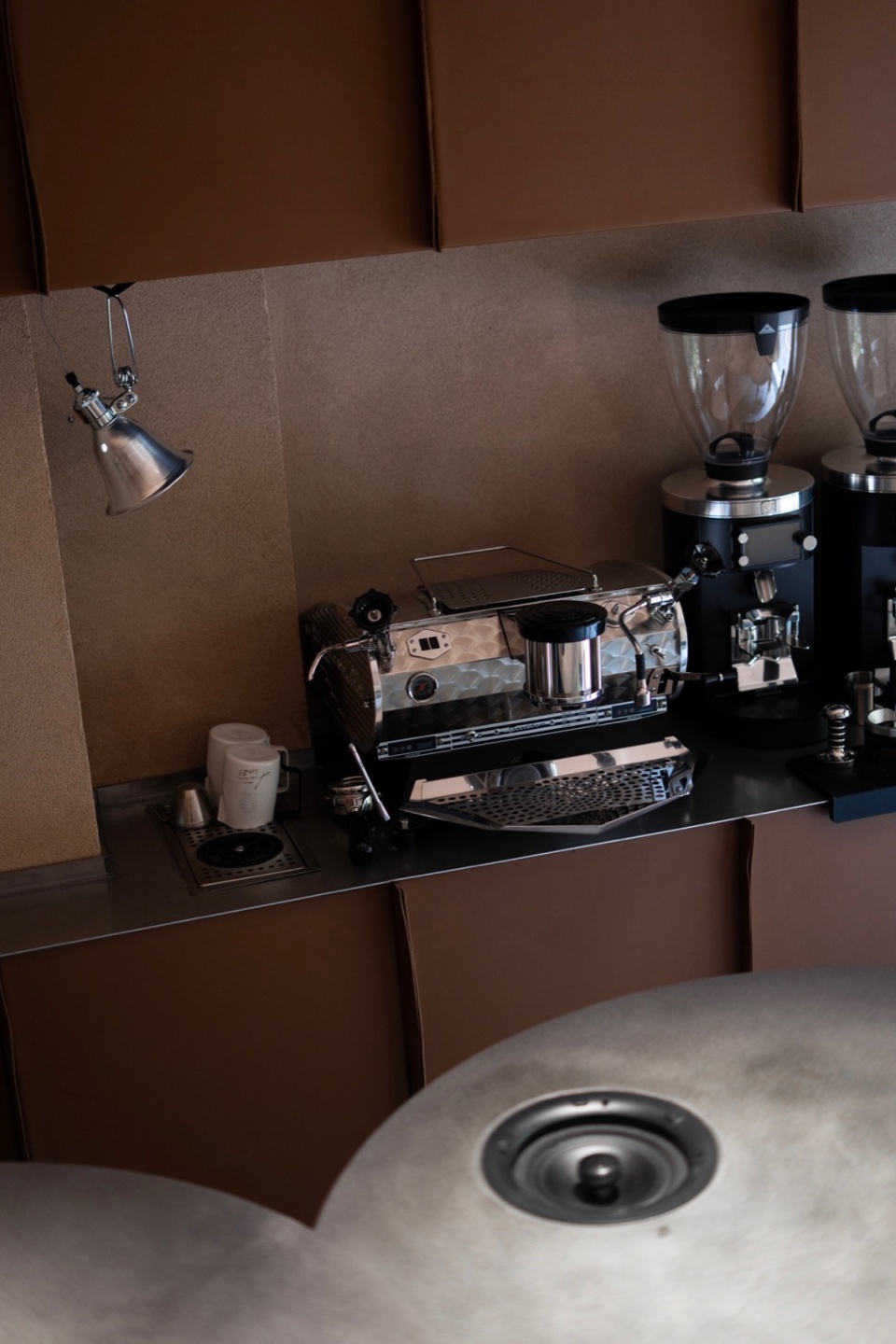 我们将空间划分为左右两部分,一侧是隐蔽原建筑结构的收纳界面,平整的柜体作为日常运营储藏需要,淡棕皮革的包裹实现柜体的柔和,另一侧是完全开畅自由的空间:咖啡师操作区与顾客休息区共享,两者划分在6个不同高低错落轻盈漂浮的金属圆盘两侧:咖啡制作,交谈,手冲,分享,寒暄…….顾客清晰的感受咖啡所有操作与情绪,既亲密又怪诞,俏皮又富有某种抽象性的表情,彼此照顾,相互关联,相互鼓励!