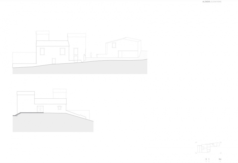 入口层设有厨房——融合了原塔楼的三层通高空间——以及面向Sierra de la Cadalt景观的起居室。上层布置了两间卧室,而下层则将曾经饲养牲畜的空间重新诠释为多功能厅。相邻的体量原用于存放农具,如今被改造成车库,上层为设计师Terence Woodgate的工作室。