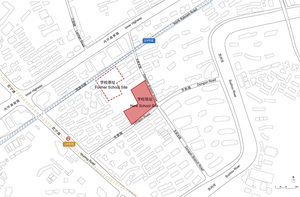 The relocation and expansion project of Wuning Middle School (now name as The Second High School Affiliated to Tongji University) is situated at 186 Dongxin Road, Putuo District. This site is located within the Inner Ring area of Shanghai, surrounded by densely populated residential neighborhood. To the north, it borders directly on Light Rail Line 3 and the Inner Ring Highway. This location experiences heavy traffic volumes and features high building density. After argument by the relevant urban planning authorities, it has been decided to relocate the school from the northwest to the southeast side of the site through a land swap strategy. This new strategy will provide efficient space for a modern secondary school with an expanded capacity of 40 classes.