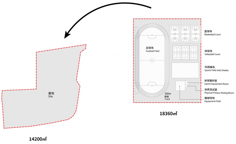 然而,在设计工作过程中面临的主要难点是可供建设用地十分局促。首先,迁址后的实际用地仅约14200平方米,远低于通常标准所需面积,大概为标准用地的三分之一。其次,按照上海市建设标准运动场地需求为18,360平方米,也远超基地承载能力,建设强度大。如何在狭窄地块上平衡高容积率与功能需求,同时兼顾校园氛围与城市环境的营造,是我们设计的核心挑战。