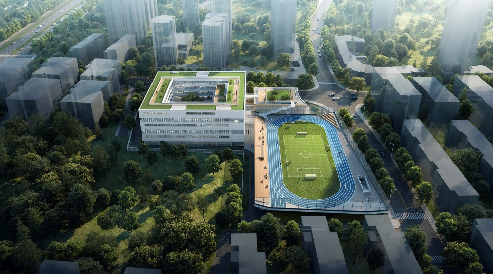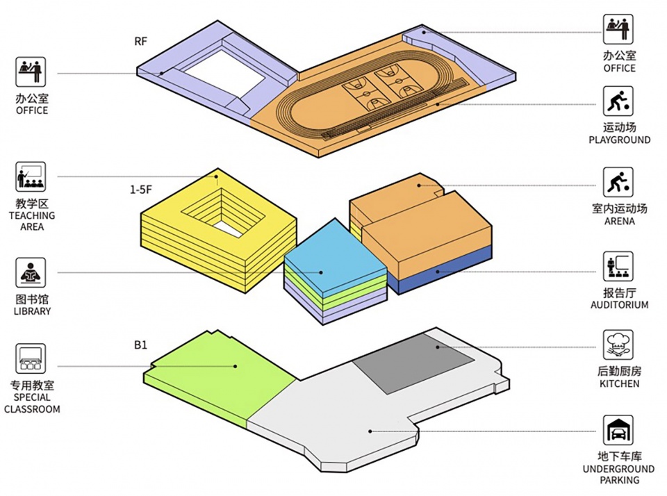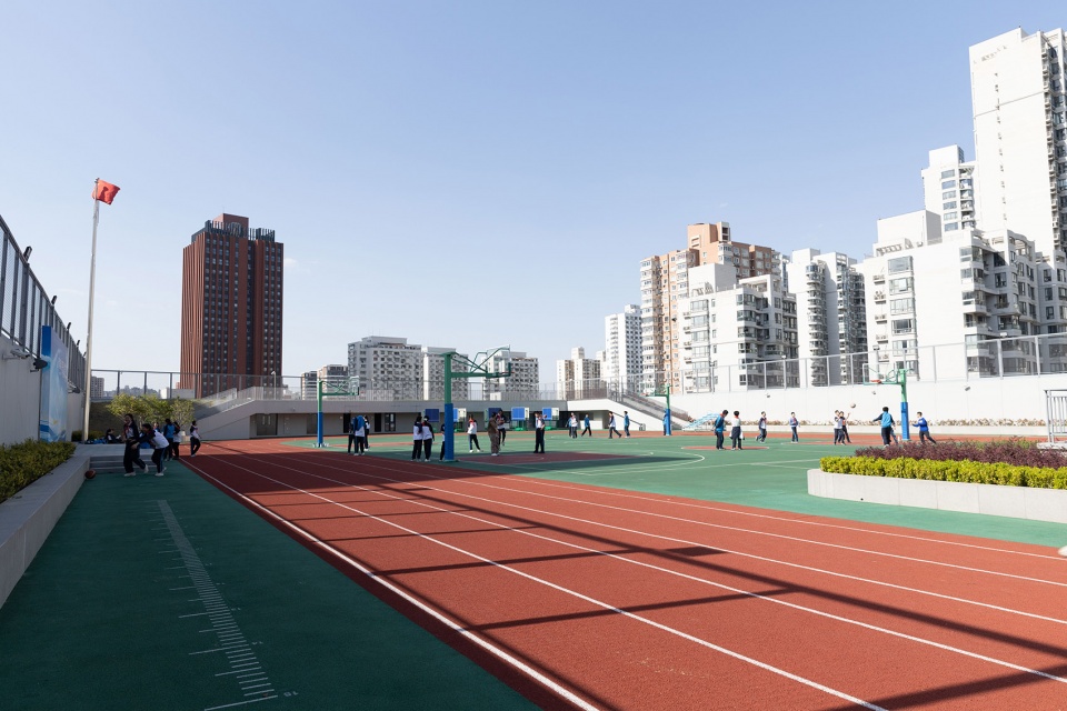 三个体量共同托举起顶部的大屋顶,屋顶西侧主要是行政办公及会议室的使用,而200米跑道、器械场地、跳远沙坑、屋顶花园和校园广播站则是布置在屋顶的东侧。为方便学生通往各楼层上课,我们也在教学楼内庭院设置室外楼梯蜿蜒向上通至屋顶活动场地,将地面、各层平台与屋顶大操场串联为一个整体,在打破空间局限、创造丰富活动体验的同时,也承担着重要的疏散功能。