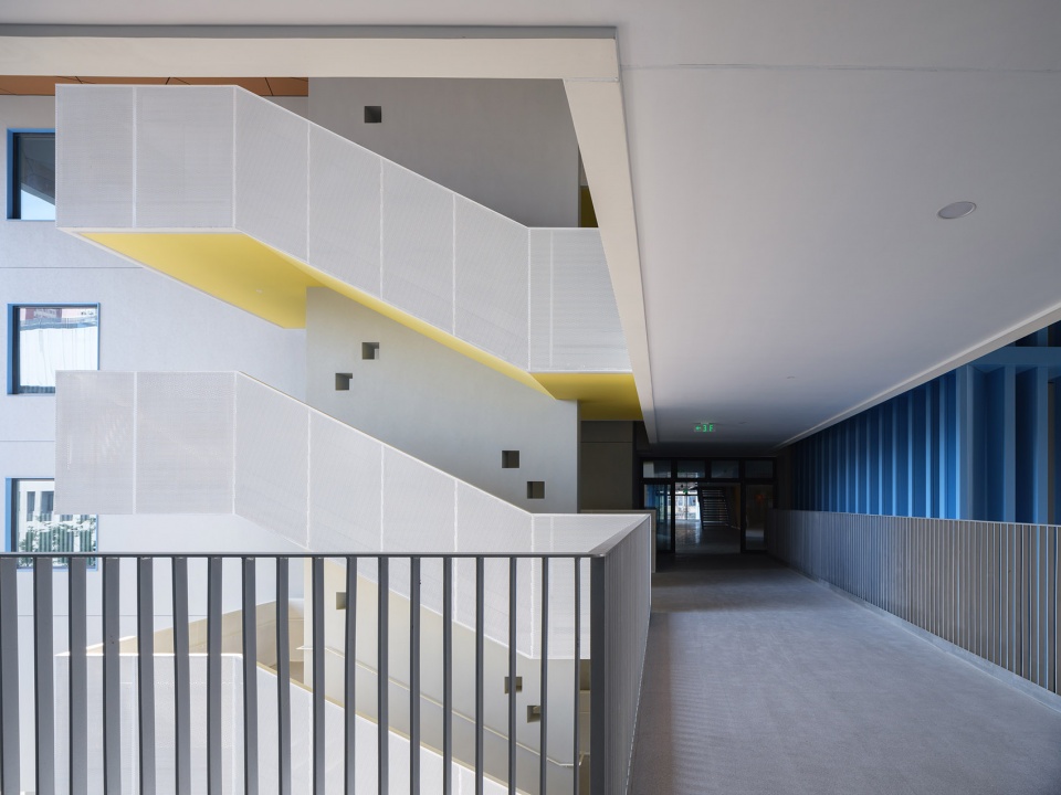 三个组团之间有水平向的交通系统连接,在每层设置室外、半室外平台与连廊,形成立体化的公共活动系统。学生可在课间奔跑、集合、远眺,人均活动面积达6平方米,有效缓解高密度校园的活动拥挤问题。