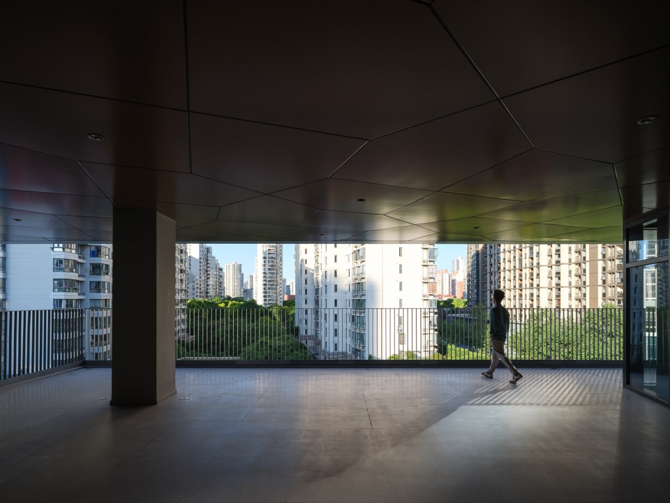 屋顶围栏高度约7米,外立面采用金属网格栅,塑造轻盈的漂浮感。从外部看该空间是城市天际线的视觉焦点,凸显了校园的独特个性。